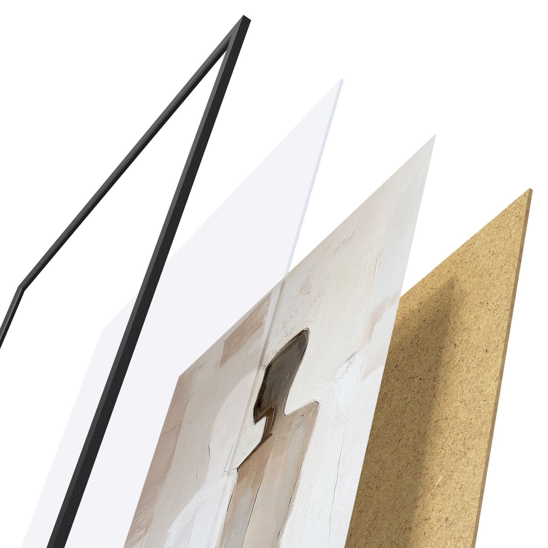 Plakāts sastāv no rāmja, pleksstikla, iespiestā attēla un skaidu plātnes pamatnes. Plakātu var uzreiz piekarināt pie sienas, pateicoties aizmugurē esošajiem stiprinājumiem.
