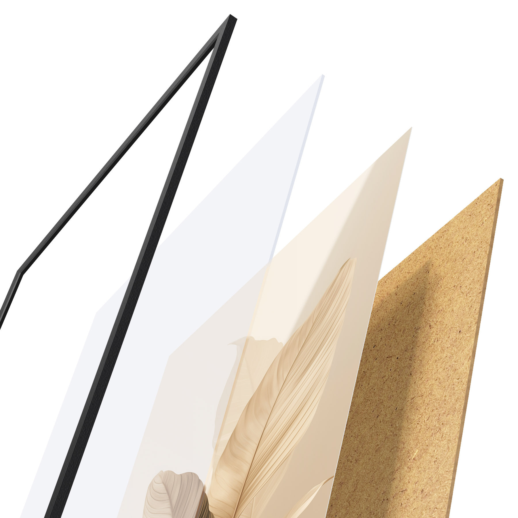 Plakāts sastāv no rāmja, pleksstikla, iespiestā attēla un skaidu plātnes pamatnes. Plakātu var uzreiz piekarināt pie sienas, pateicoties aizmugurē esošajiem stiprinājumiem.