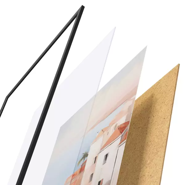 Plakāts sastāv no rāmja, pleksstikla, iespiestā attēla un skaidu plātnes pamatnes. Plakātu var uzreiz piekarināt pie sienas, pateicoties aizmugurē esošajiem stiprinājumiem.