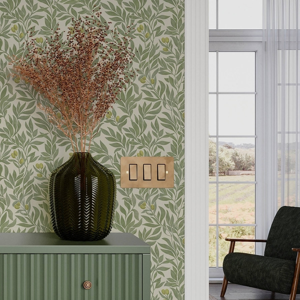 Svītras ar spirālveida ornamentu un lielām zaļām zarām