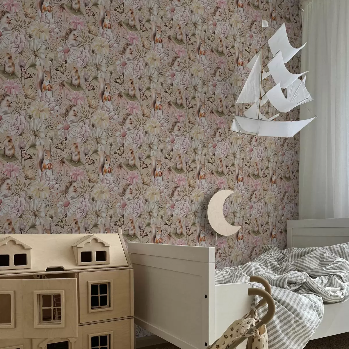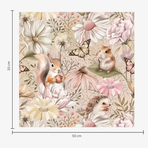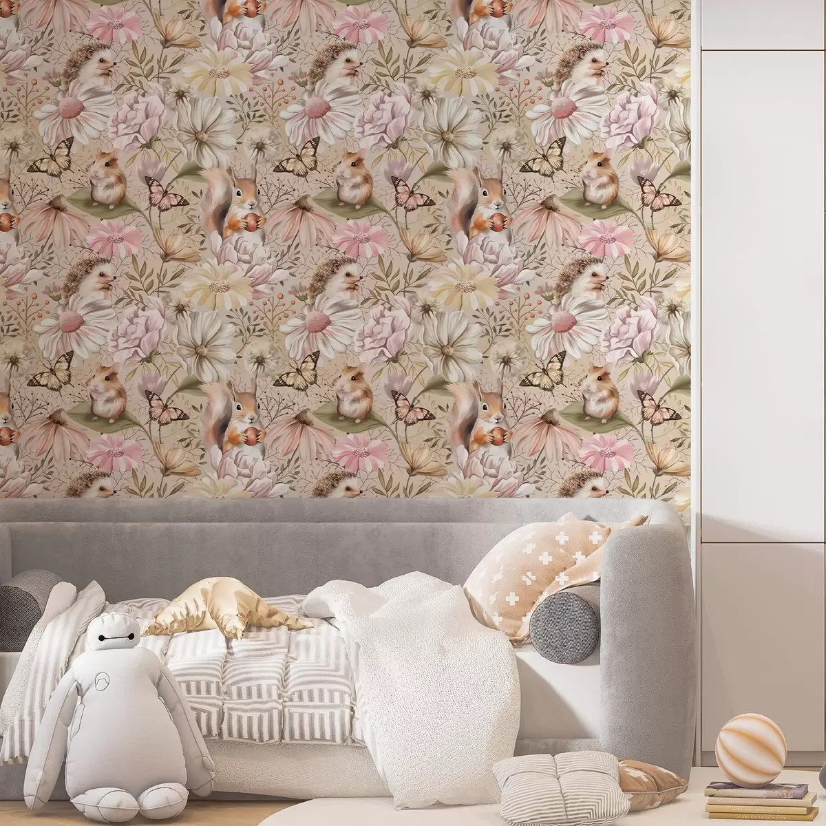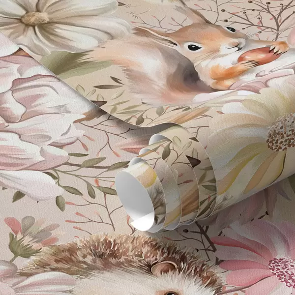 Tapetes Mīlīgs ezis, vāverīte, kāmītis un tauriņi ar ziediem pasteļtoņos Nr. a00051