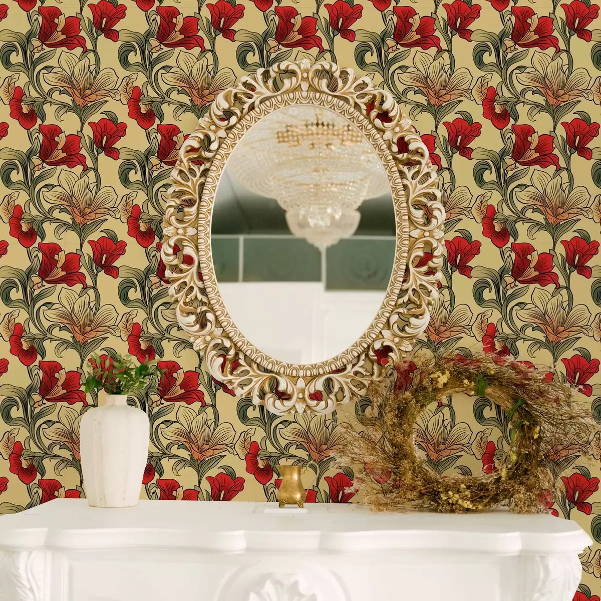 Tapetes Spilgti savīti stublāji ar lapām un sarkaniem ziediem Nr. a00075