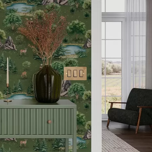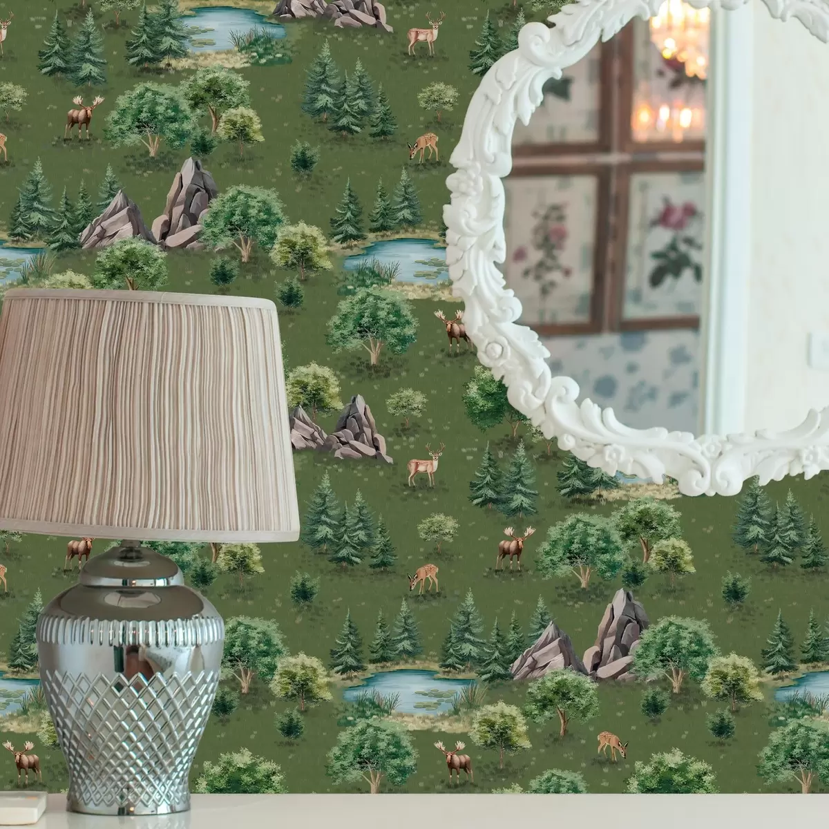 Tapetes Brieži pie ezera ar kokiem un akmeņiem Nr. a00086