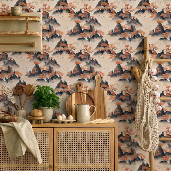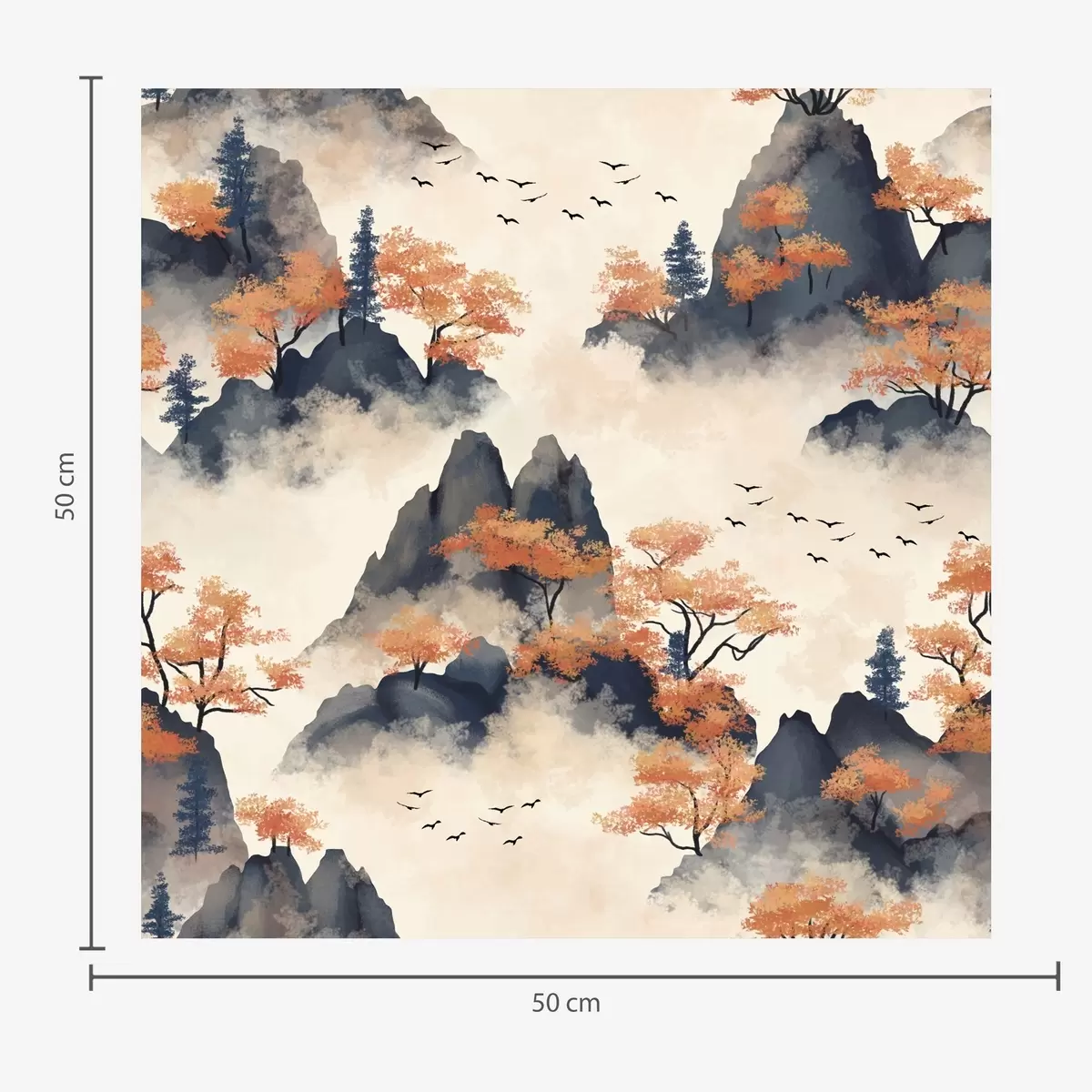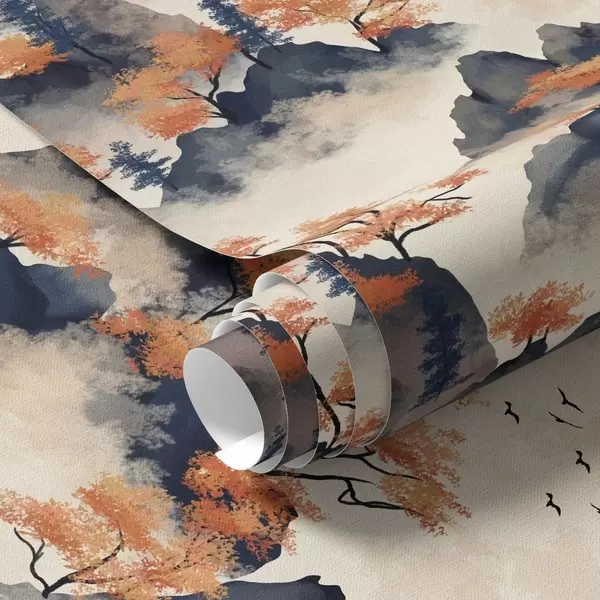 Tapetes Rudens kalni miglā ar oranžiem kokiem un putniem Nr. a00104