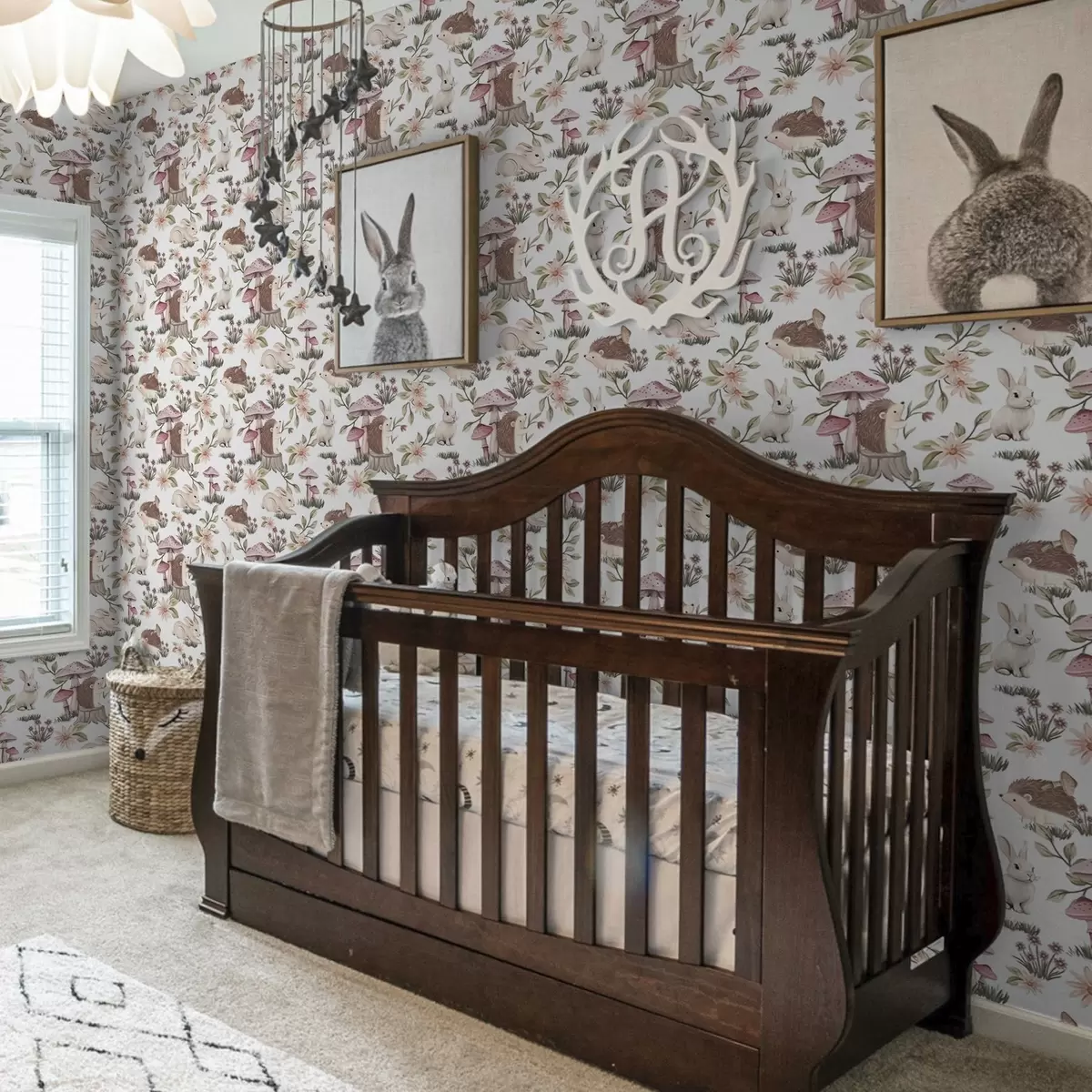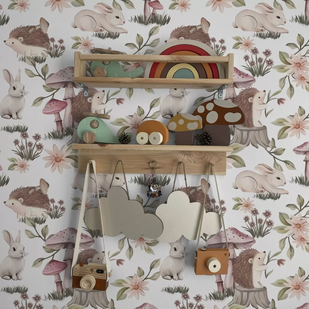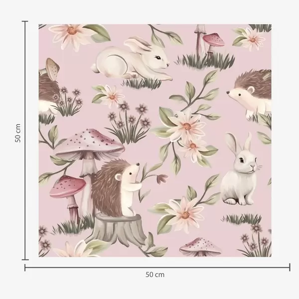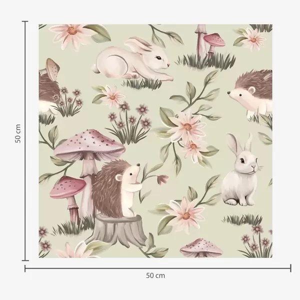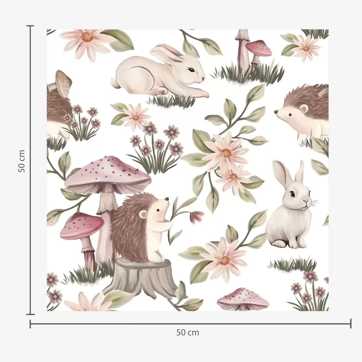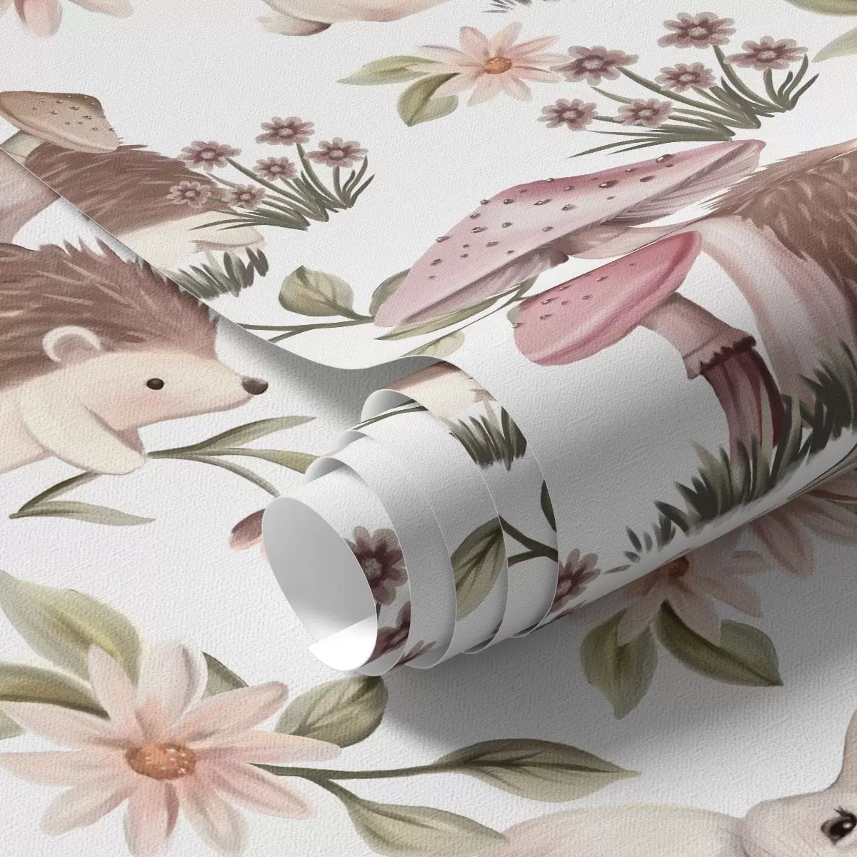 Tapetes Eži un truši uz balta fona ar maigiem ziediem un sēnēm Nr. a00111v2