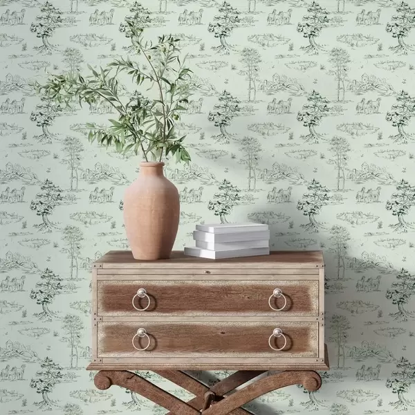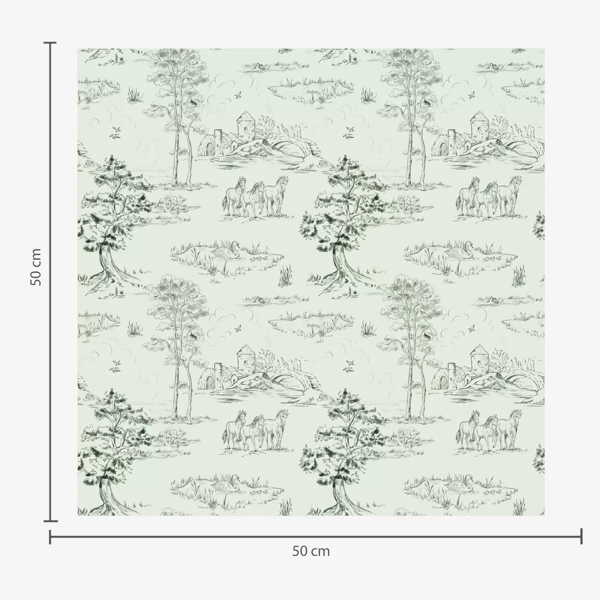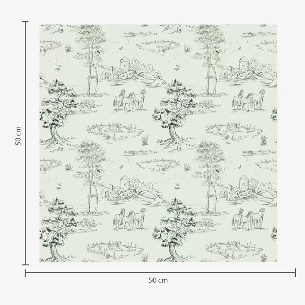 Tapetes Skatuve ar zirgiem, kokiem un pili uz zaļa fona Nr. a00133v1