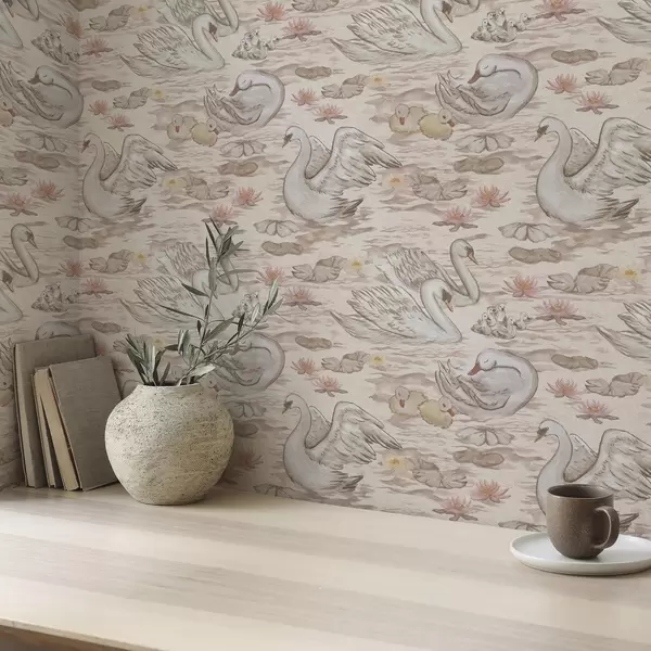 Tapetes Gulbji ar cāļiem uz rozā fona ar ūdens lilijām Nr. a00176