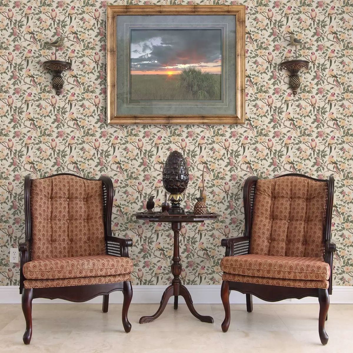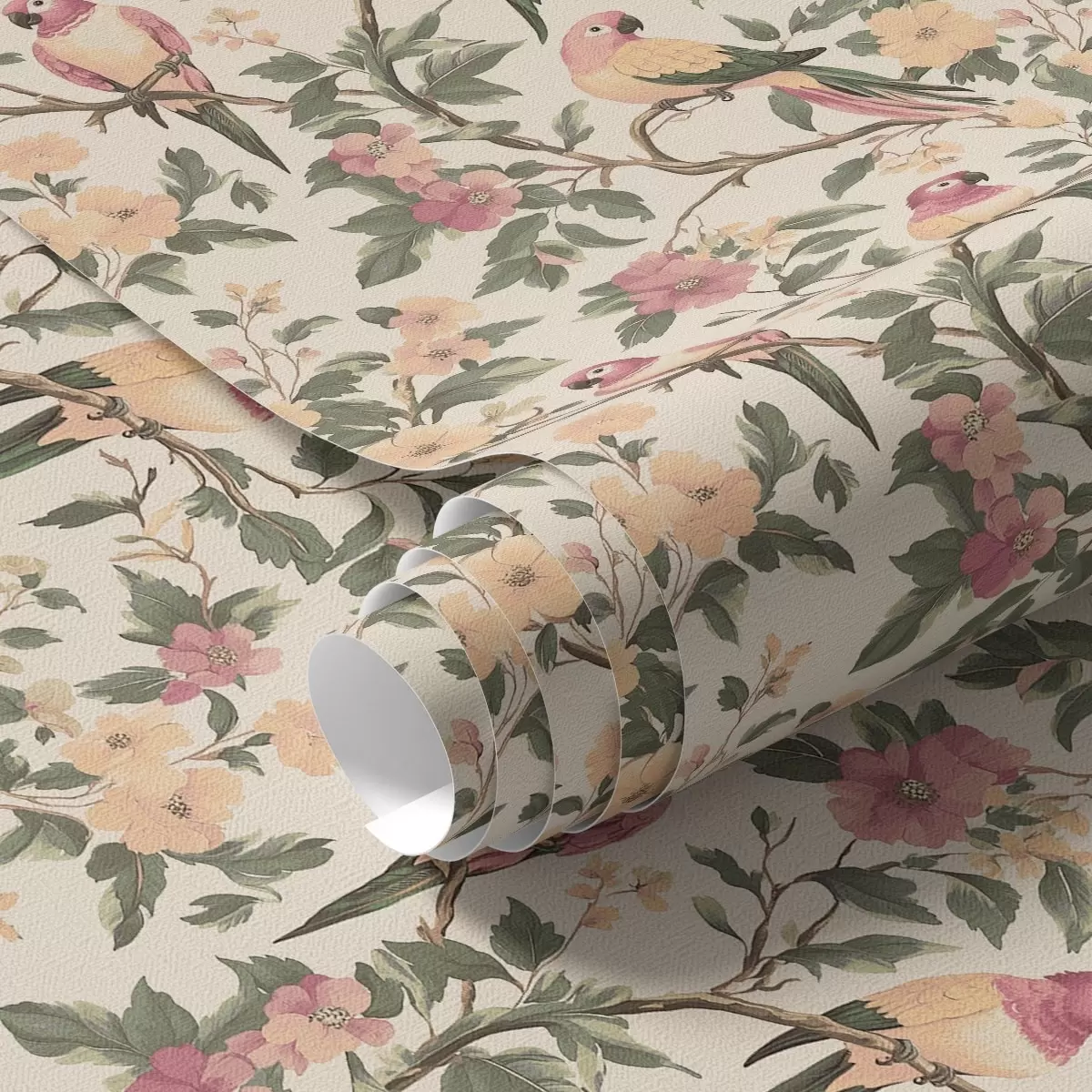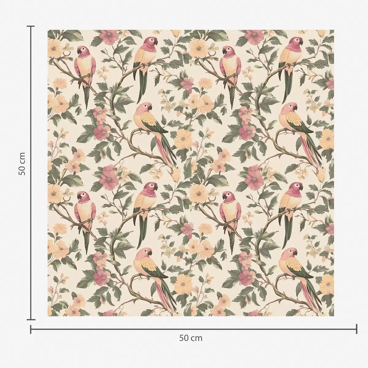 Tapetes Tropu putni uz ziedošiem zariem pasteļtoņos Nr. a00199