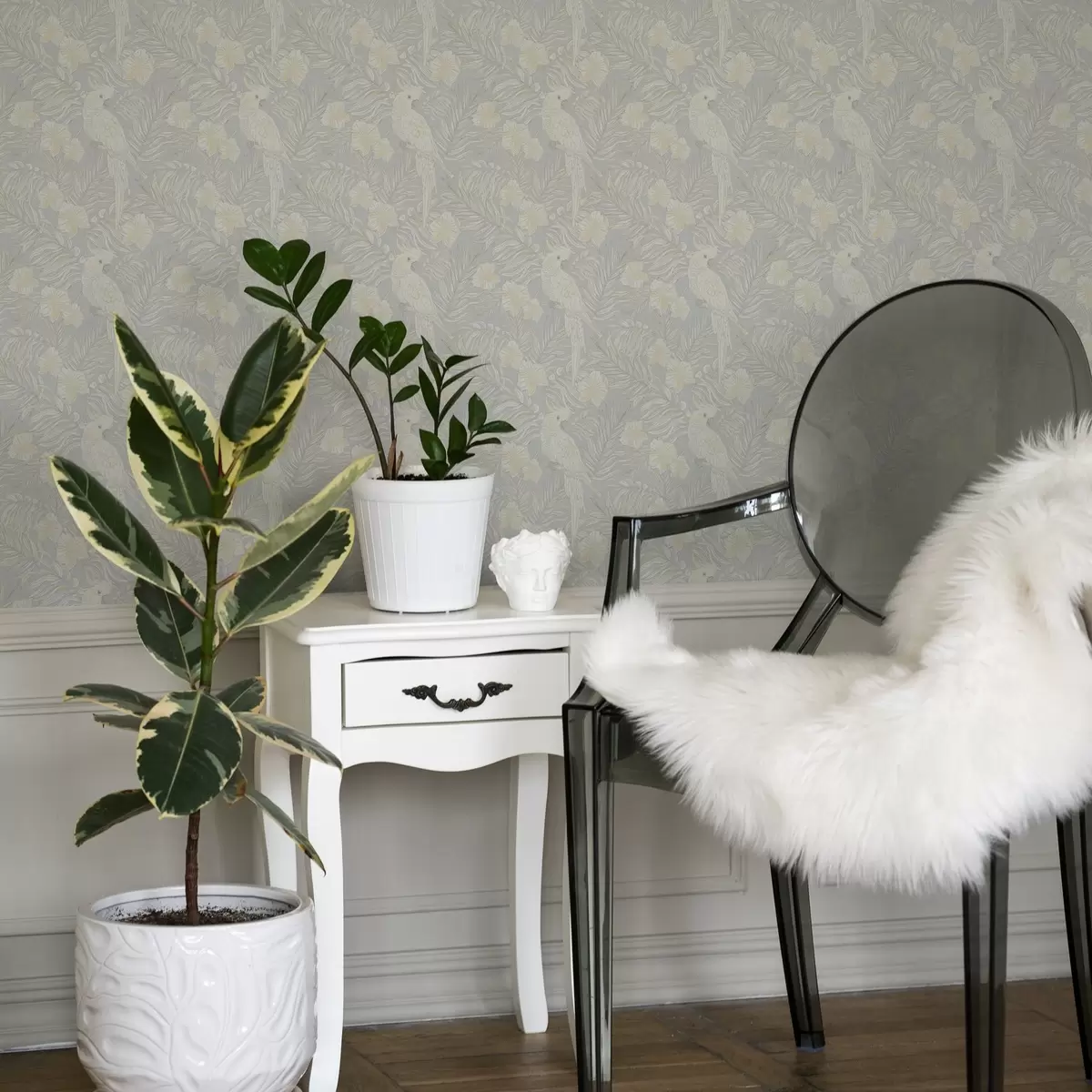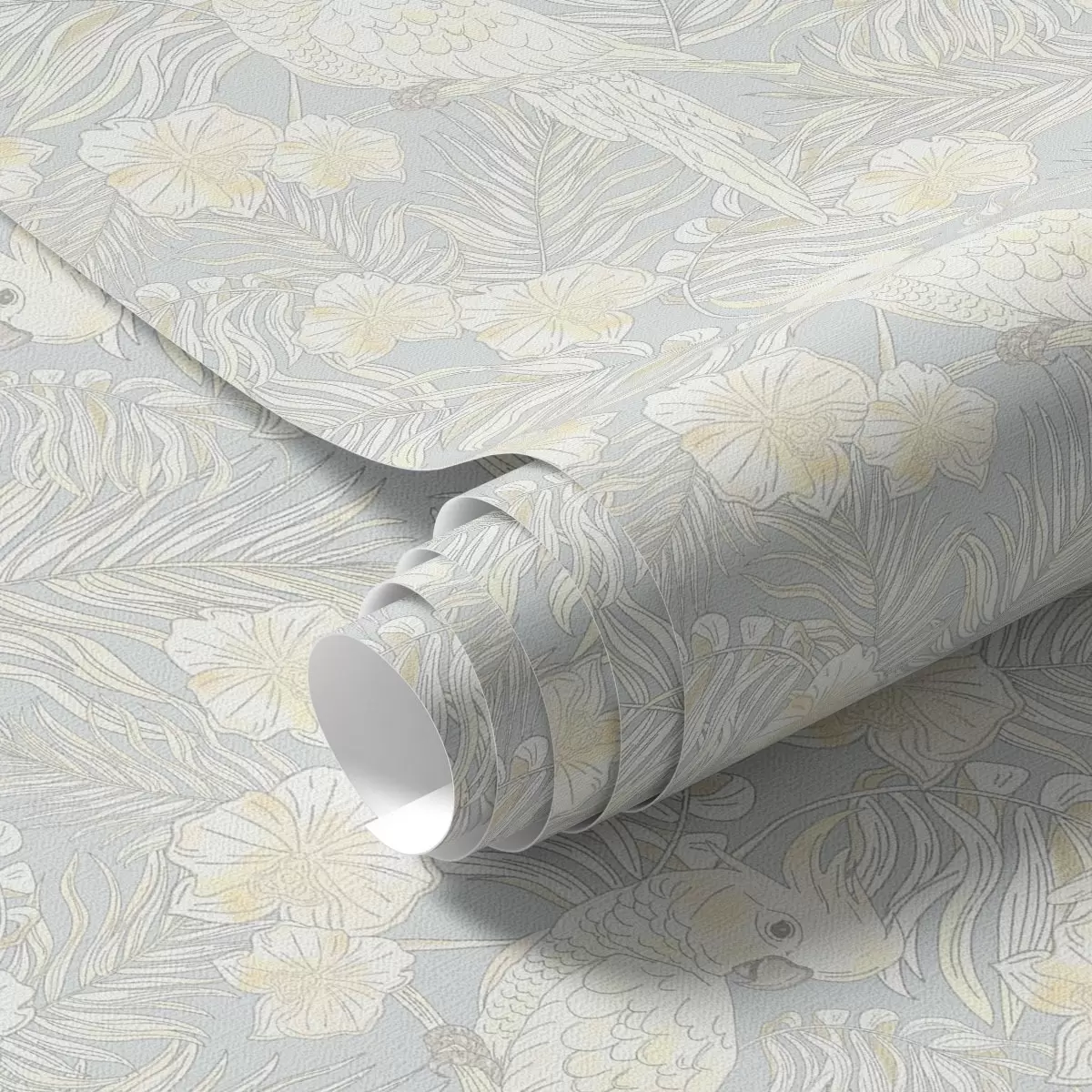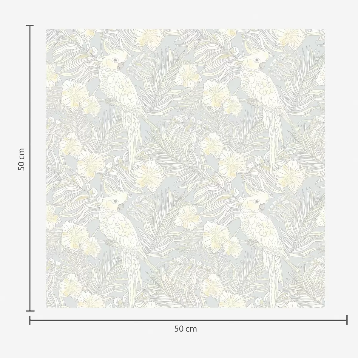Tapetes Viegla tropu apdruka ar kakadu un ziediem uz zila fona Nr. a00203