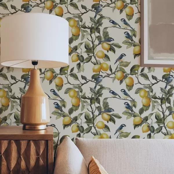 Tapetes Putni un citroni uz zariem, akvareļu botāniskais zīmējums Nr. a00207