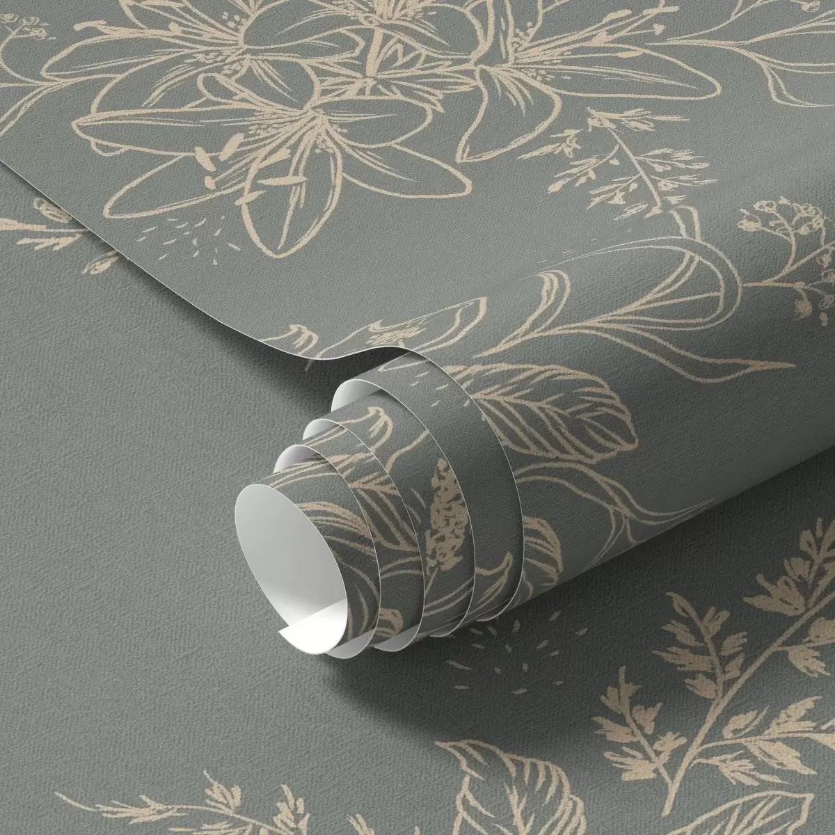 Tapetes Kontūru ziedi uz zili pelēka fona, elegants botāniskais raksts Nr. a00226