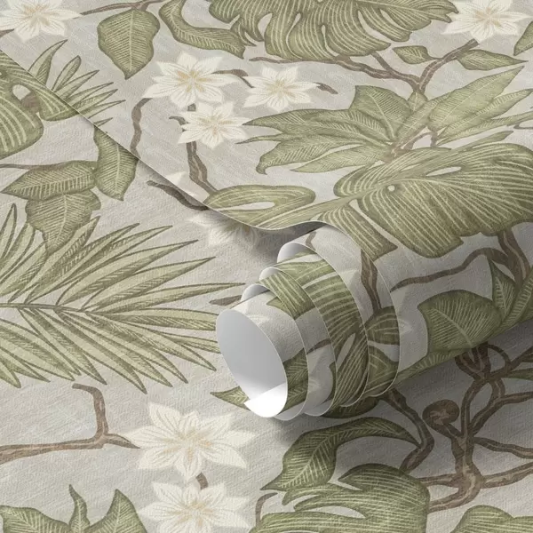 Tapetes Tropu monsteras lapas un ziedi uz pelēka fona Nr. a00249