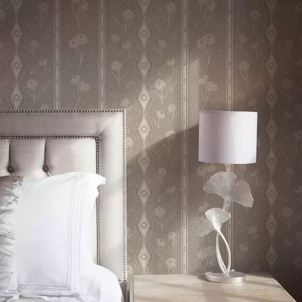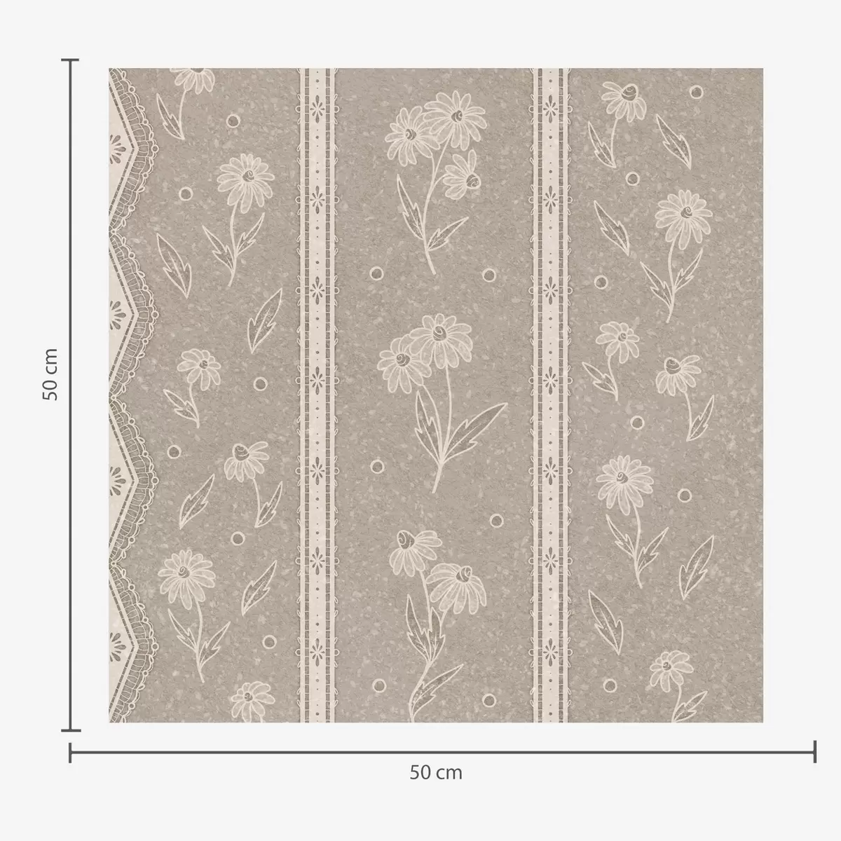 Tapetes Svītras ar margrietiņām un mežģīnēm uz pelēkbrūžaina fona Nr. a00295