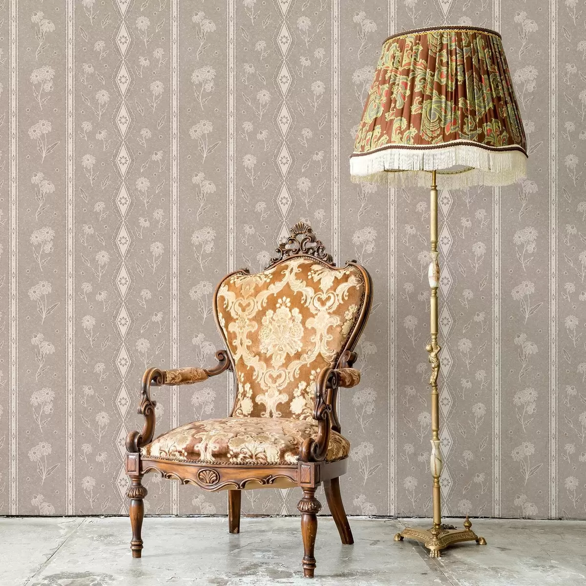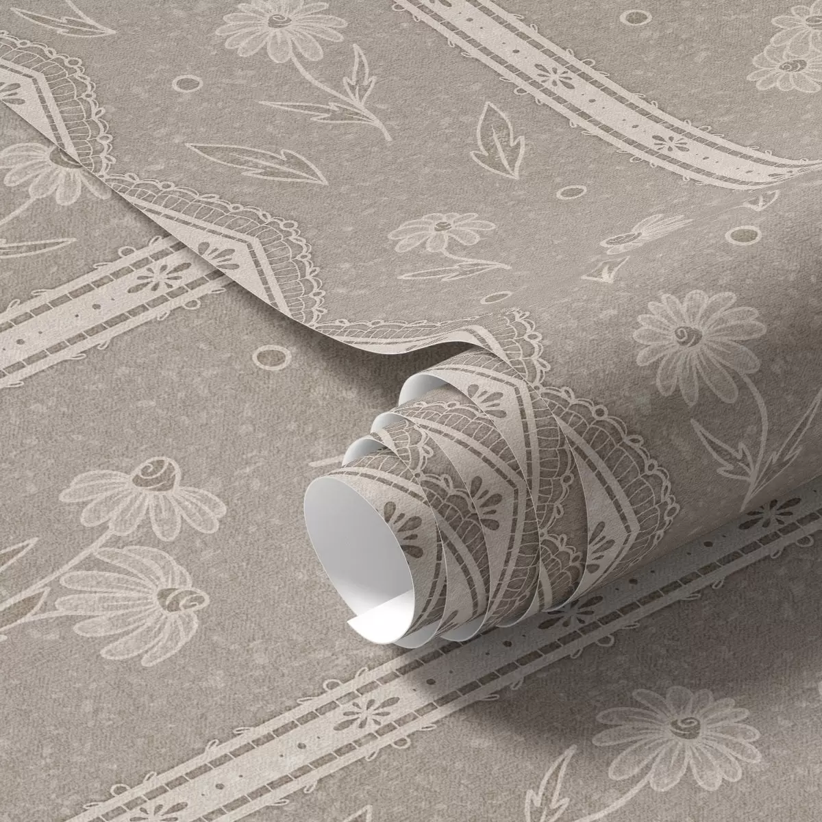 Tapetes Svītras ar margrietiņām un mežģīnēm uz pelēkbrūžaina fona a00295