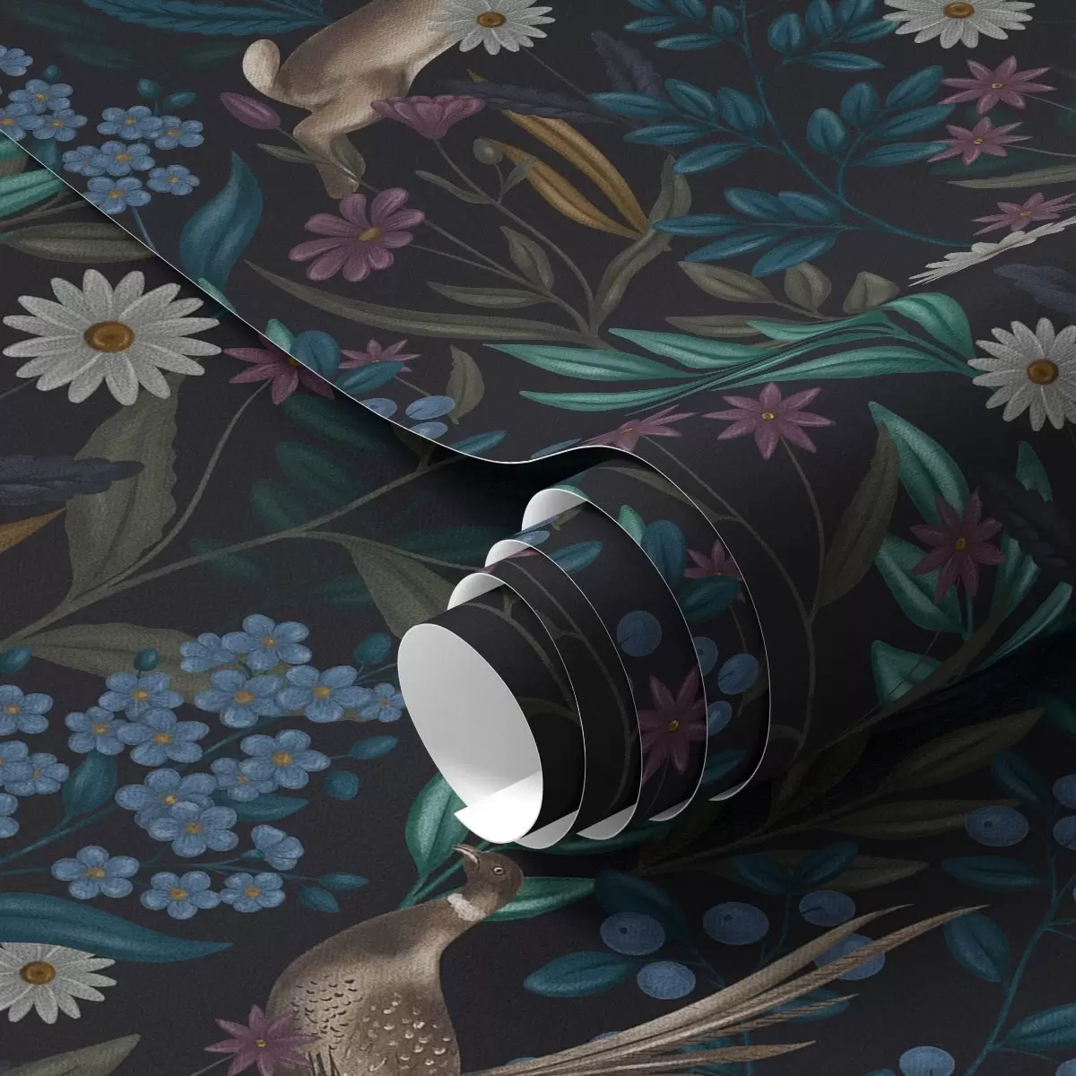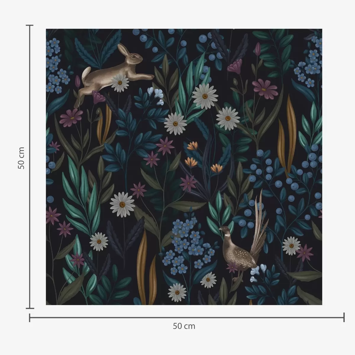 Tapetes Tumšs mežs ar ziediem, zaķi un putnu Nr. a00310