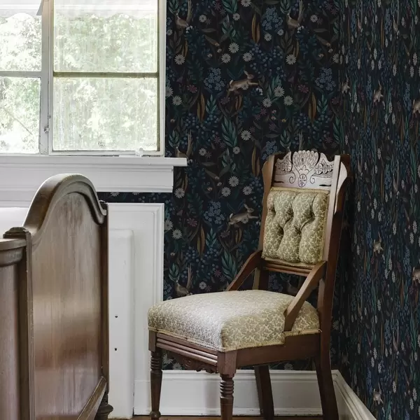 Tapetes Tumšs mežs ar ziediem, zaķi un putnu Nr. a00310