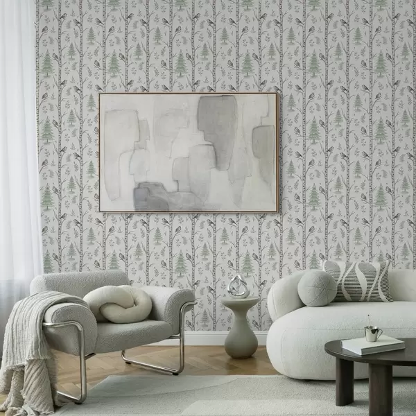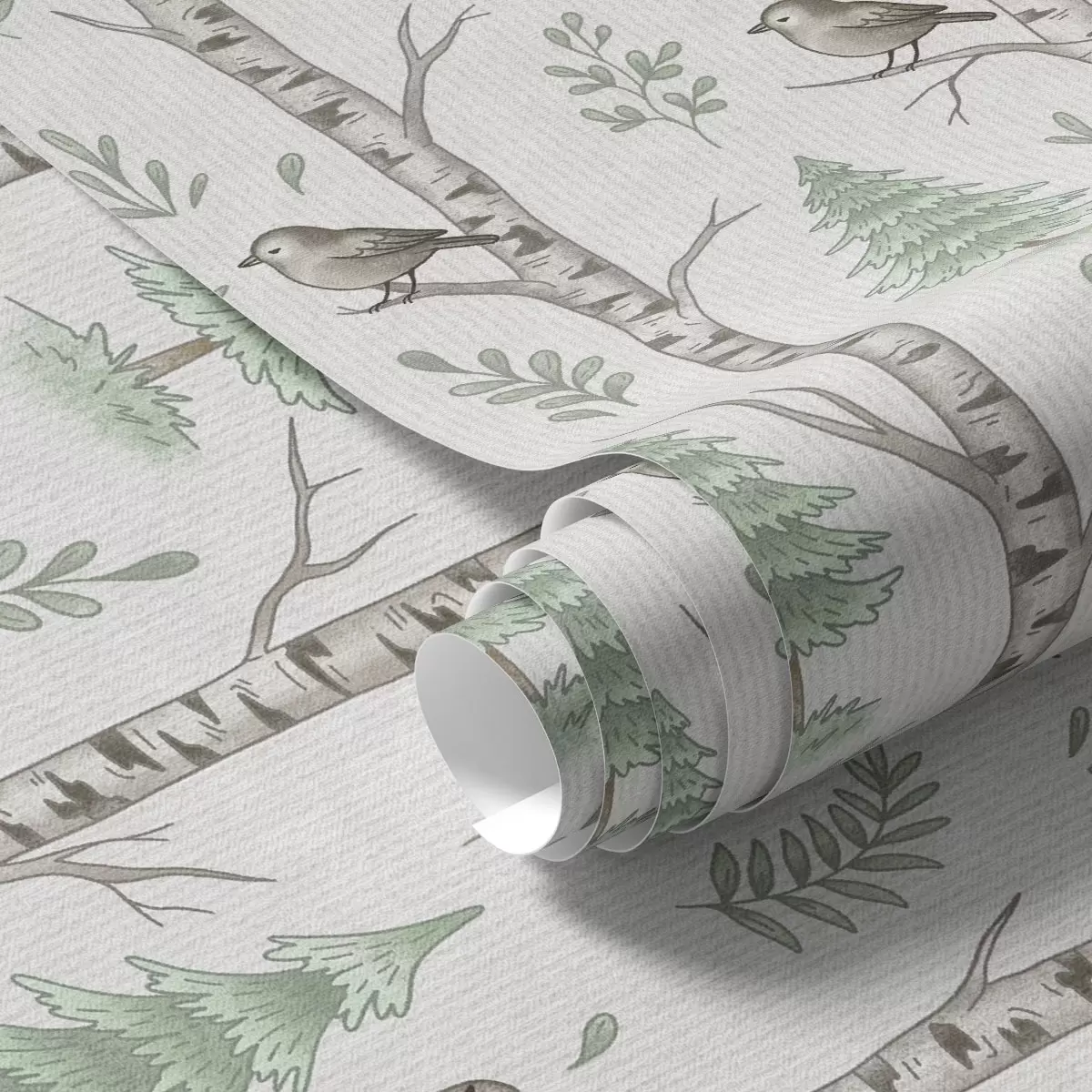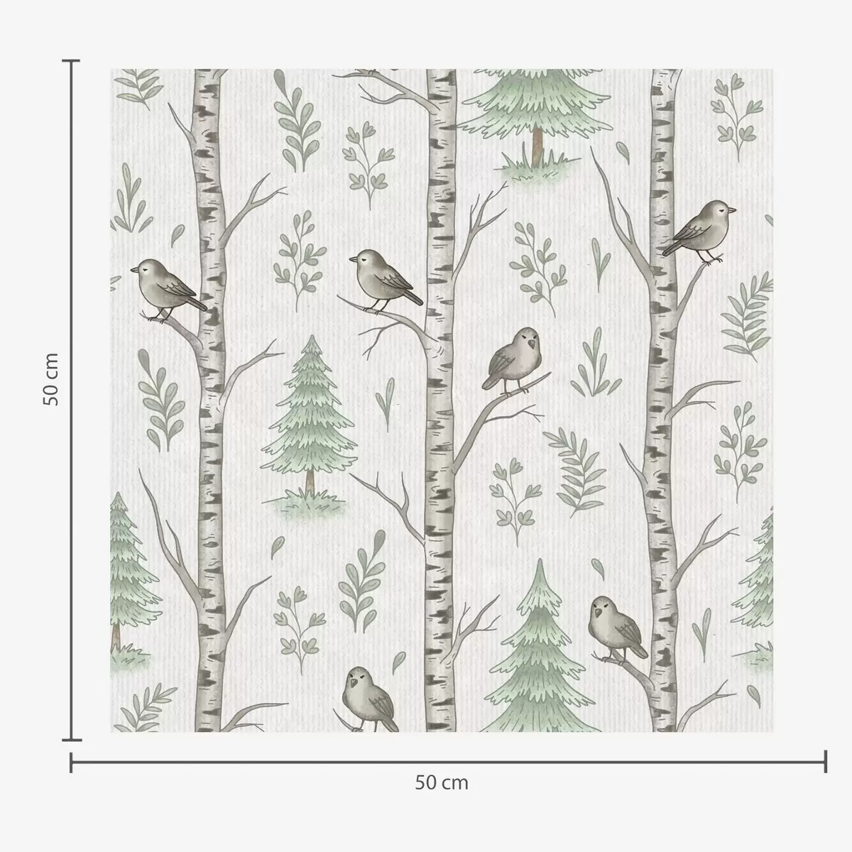 Tapetes Bērzi ar putniem gaiši zaļā mežā Nr. a00316