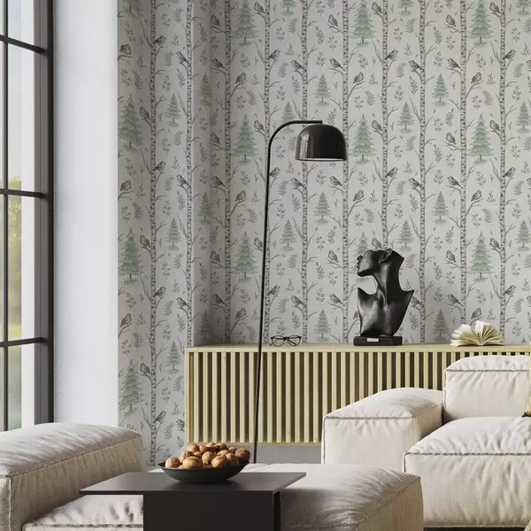 Tapetes Bērzi ar putniem gaiši zaļā mežā Nr. a00316