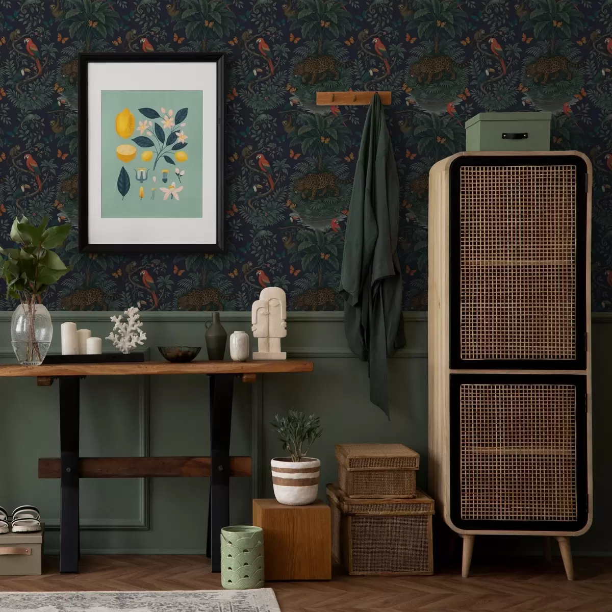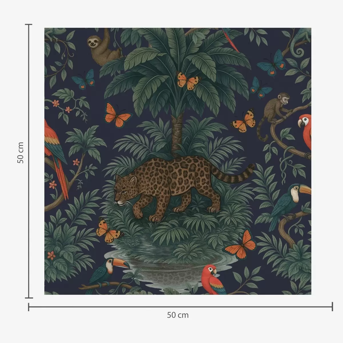 Tapetes Tropu džungļi ar leopardu, leopardu, papagaiļiem un tauriņiem Nr. a00388