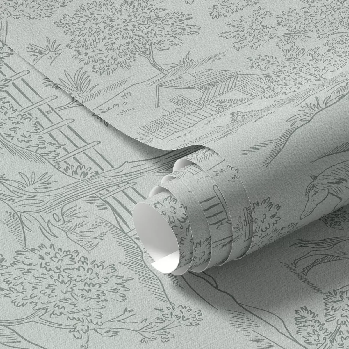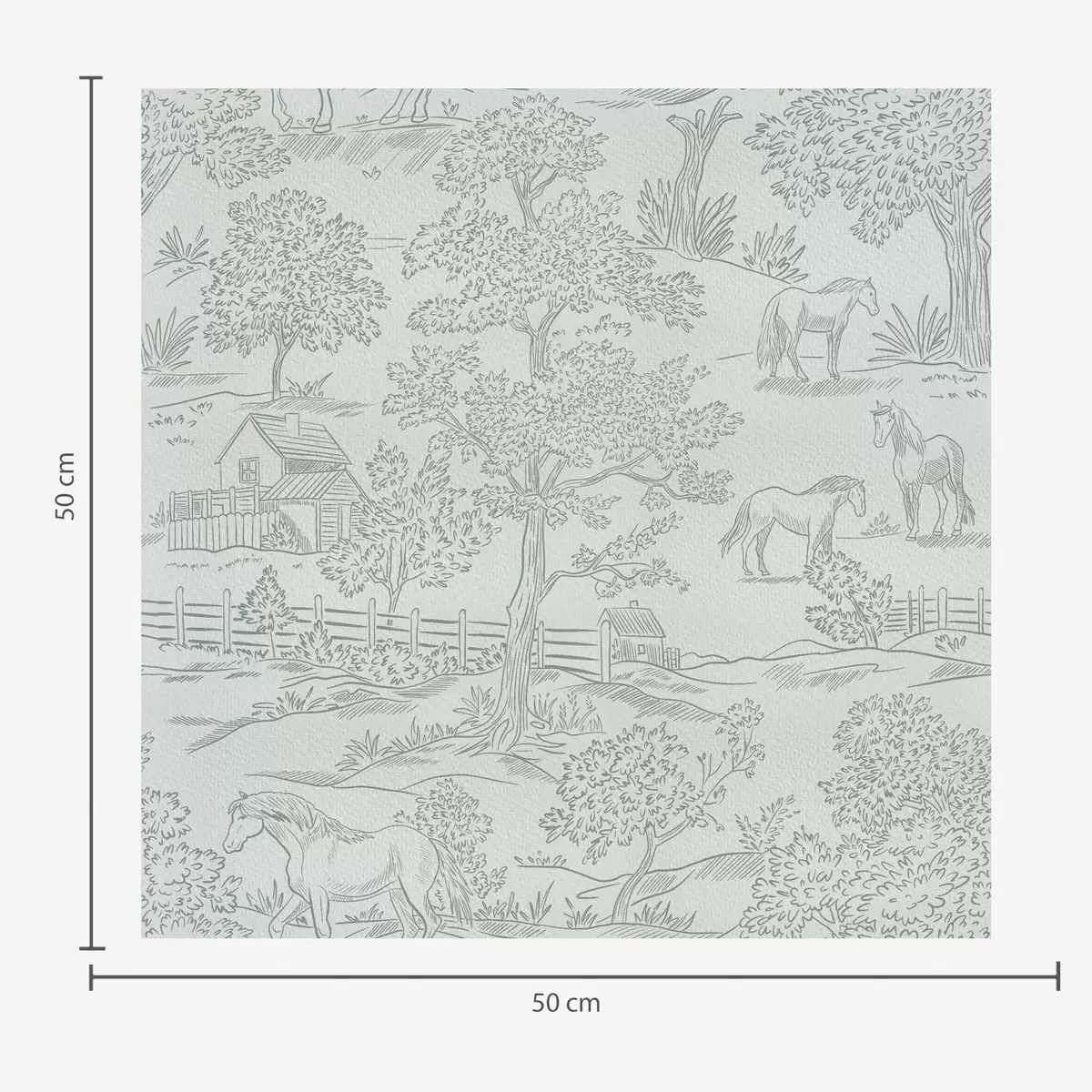 Tapetes Zaļa melnbalta ainava ar zirgiem un mājiņām Nr. a00407