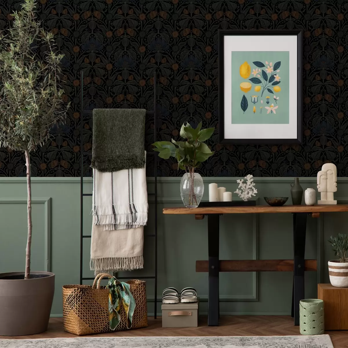Tapetes Tumšs ziedu ornaments ar oranžiem akcentiem Nr. a00411