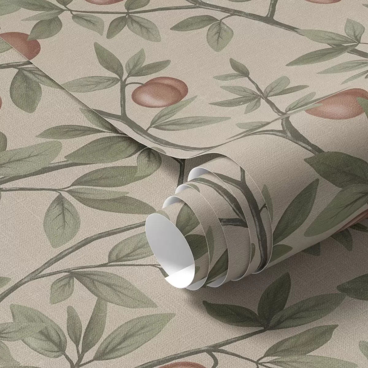 Tapetes Persiki uz zariem ar zaļām lapām uz bēša fona a00429