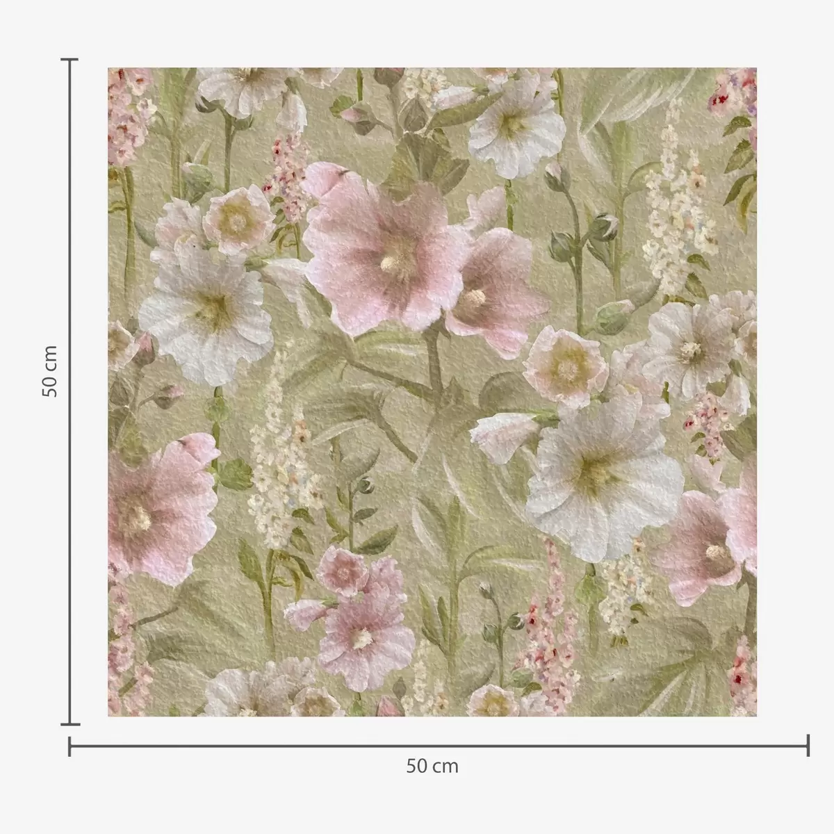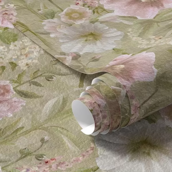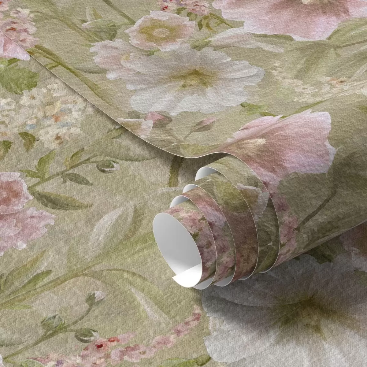 Tapetes Romantiskas rozā un baltas hollyhocks uz izslēgta zaļš Nr. a00456