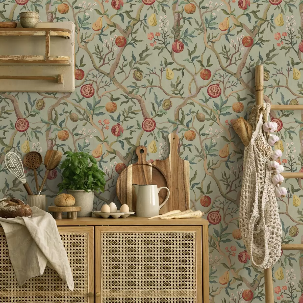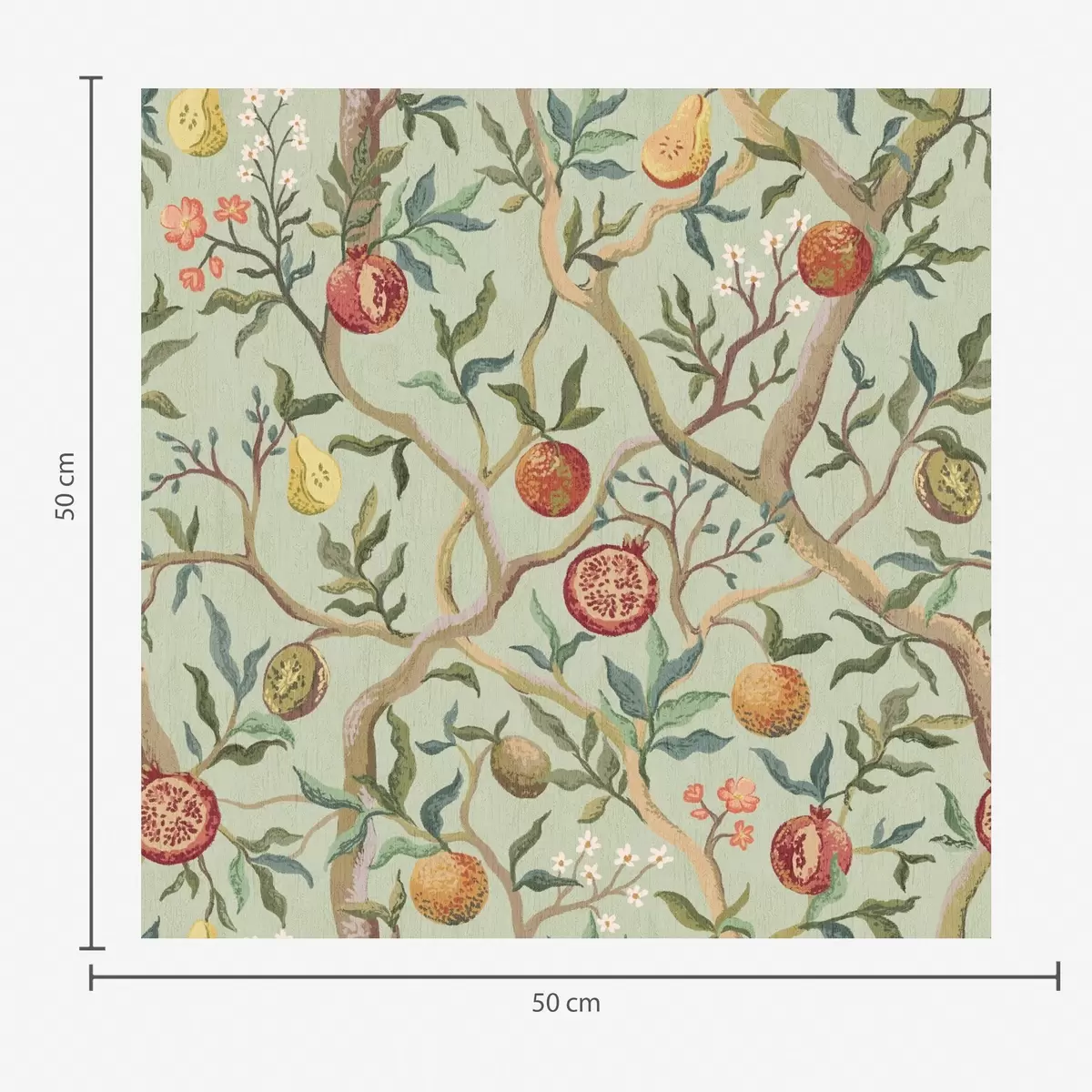 Tapetes Granātābolu augļi, bumbieri un ziedi uz gaiši zaļa fona Nr. a00465