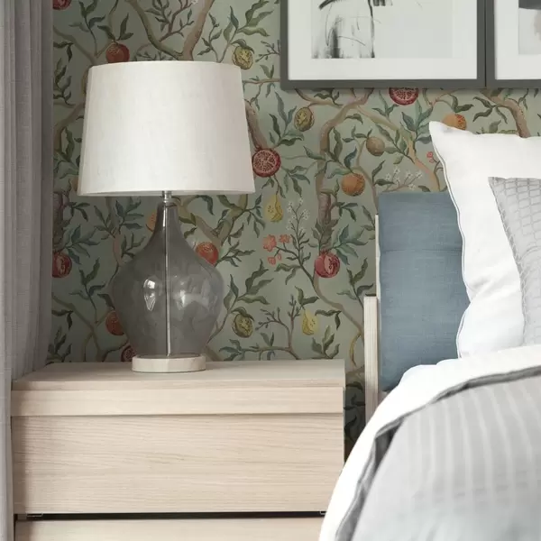 Tapetes Granātābolu augļi, bumbieri un ziedi uz gaiši zaļa fona Nr. a00465