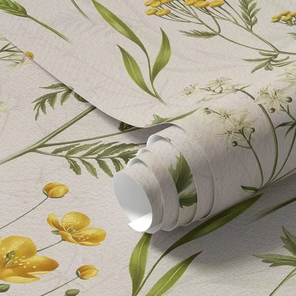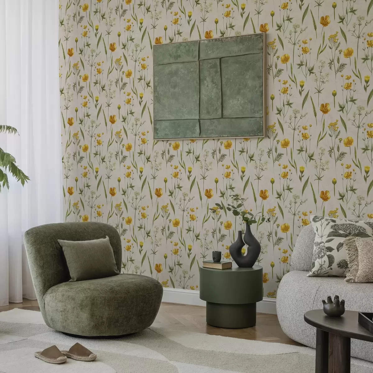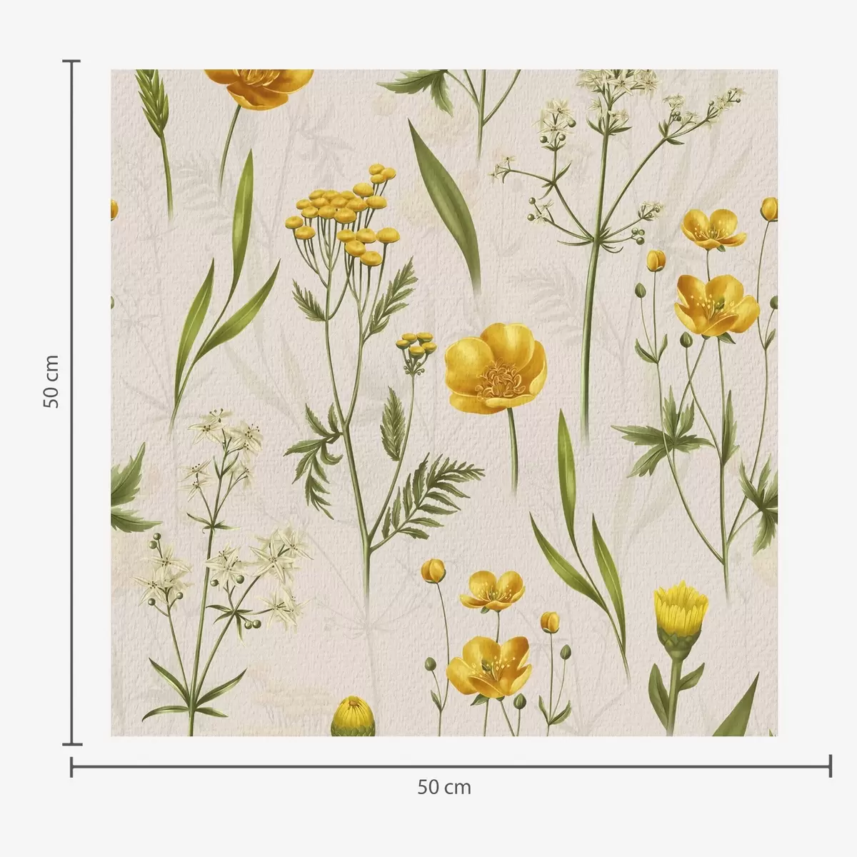 Tapetes Dzelteni ziedi un zaļumi uz bēša fona Nr. a00472v2