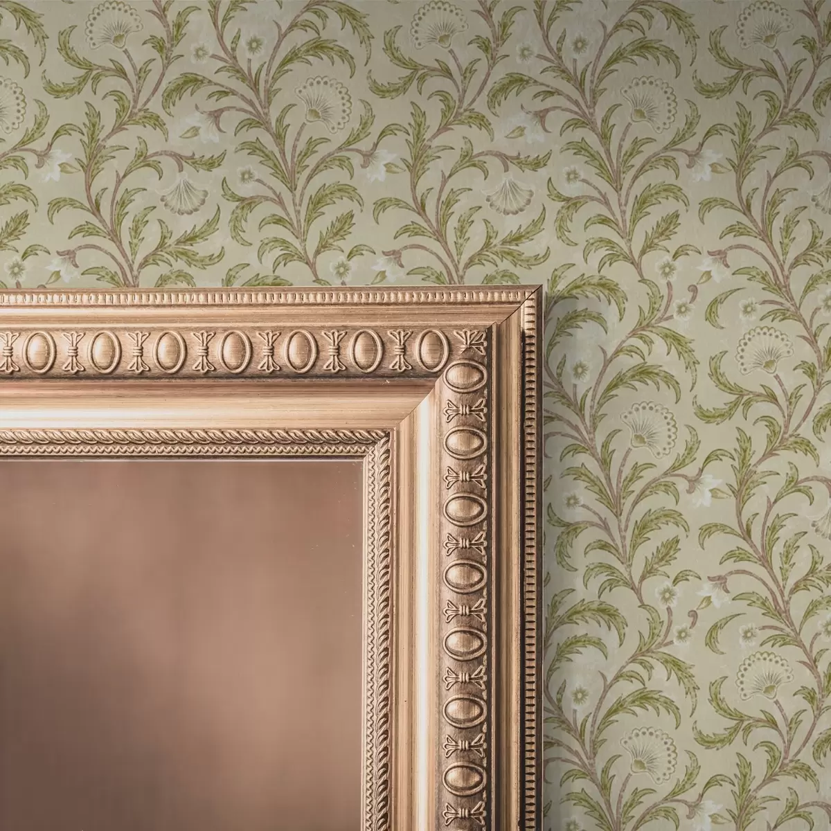 Tapetes Vintage ornament ar volūtām un ziediem, smilškrāsas un olīvu krāsā Nr. a00574