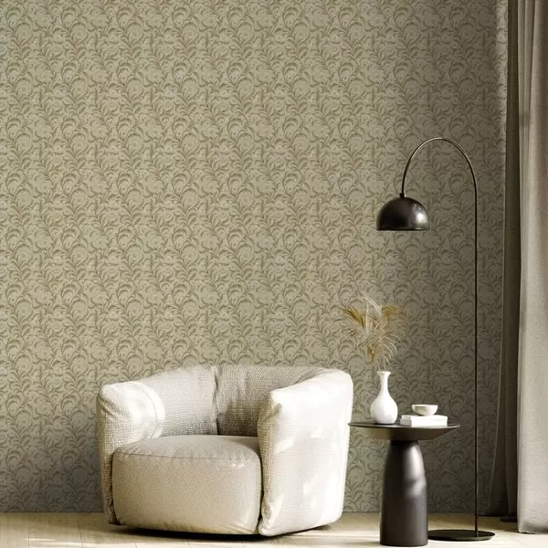 Tapetes Vintage ornament ar volūtām un ziediem, smilškrāsas un olīvu krāsā Nr. a00574