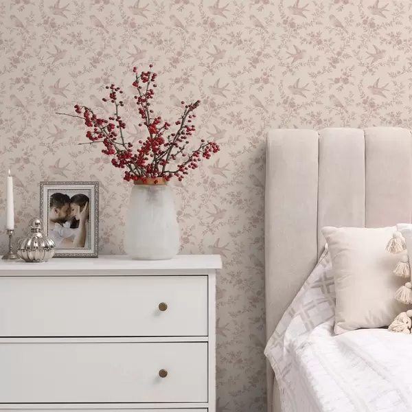 Tapetes Putni un rozes, vintage raksts uz pūderrozā fona Nr. a00587