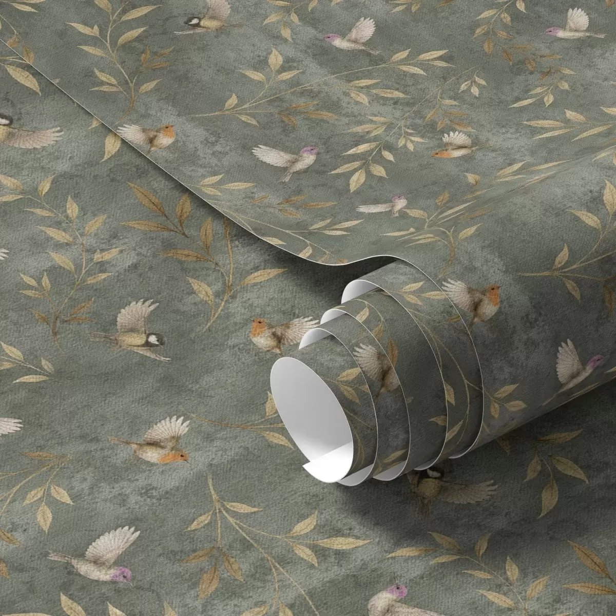 Tapetes Putni oranžā lapotnē uz tumši zaļa fona Nr. a00591