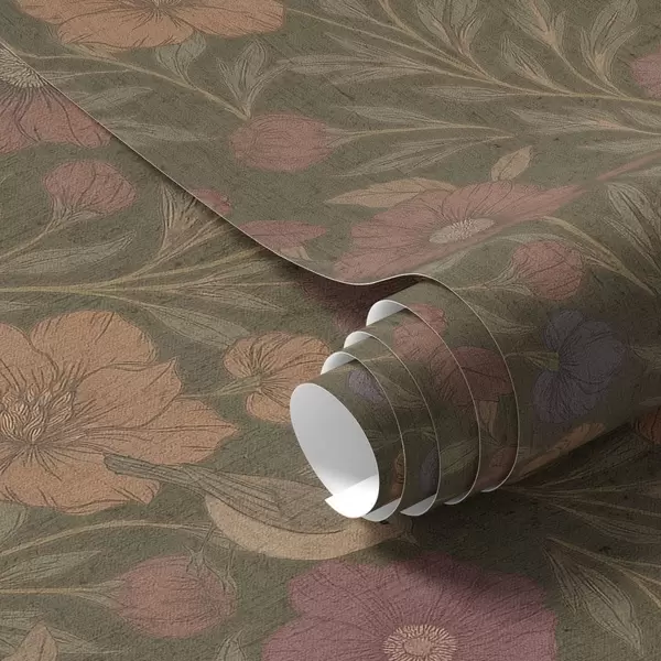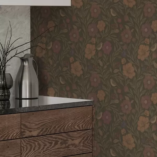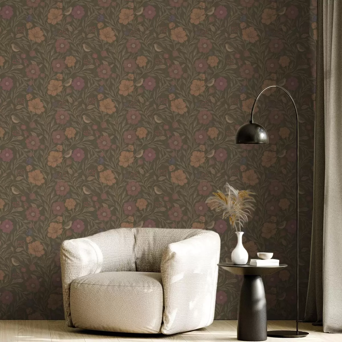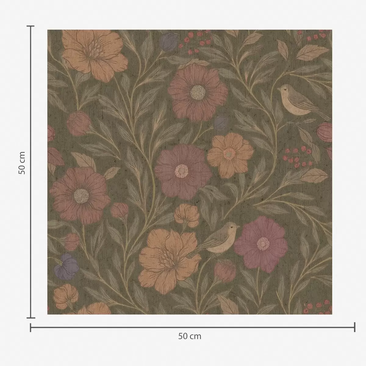 Tapetes Rudens ziedi un putni uz olīvu brūna fona Nr. a00605