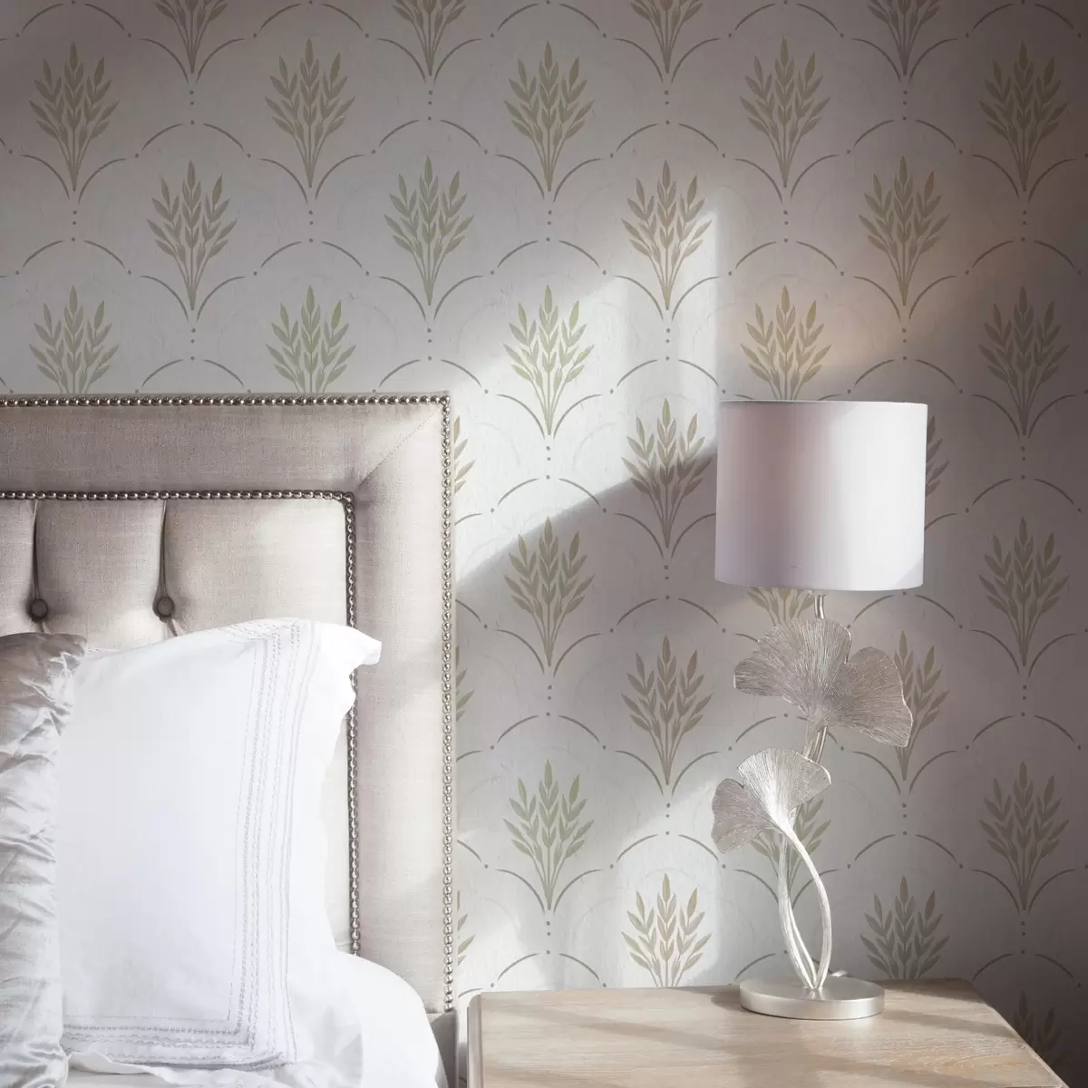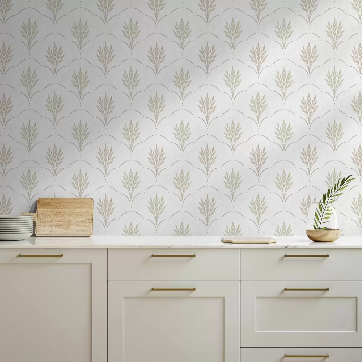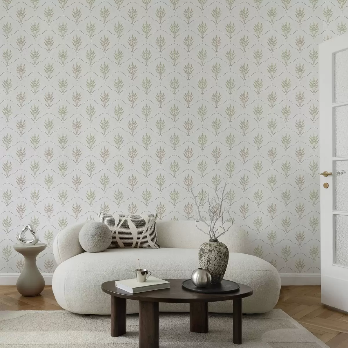Tapetes Kvieši arkuveida ornamentā, maigi pasteļtoņi uz balta fona Nr. a00607v1