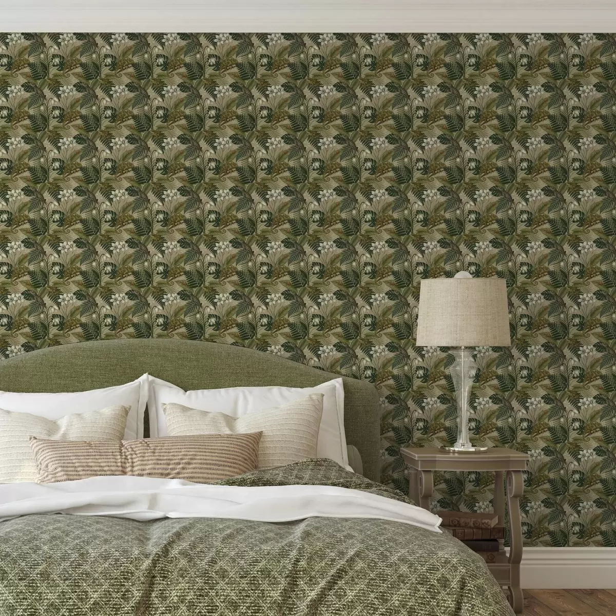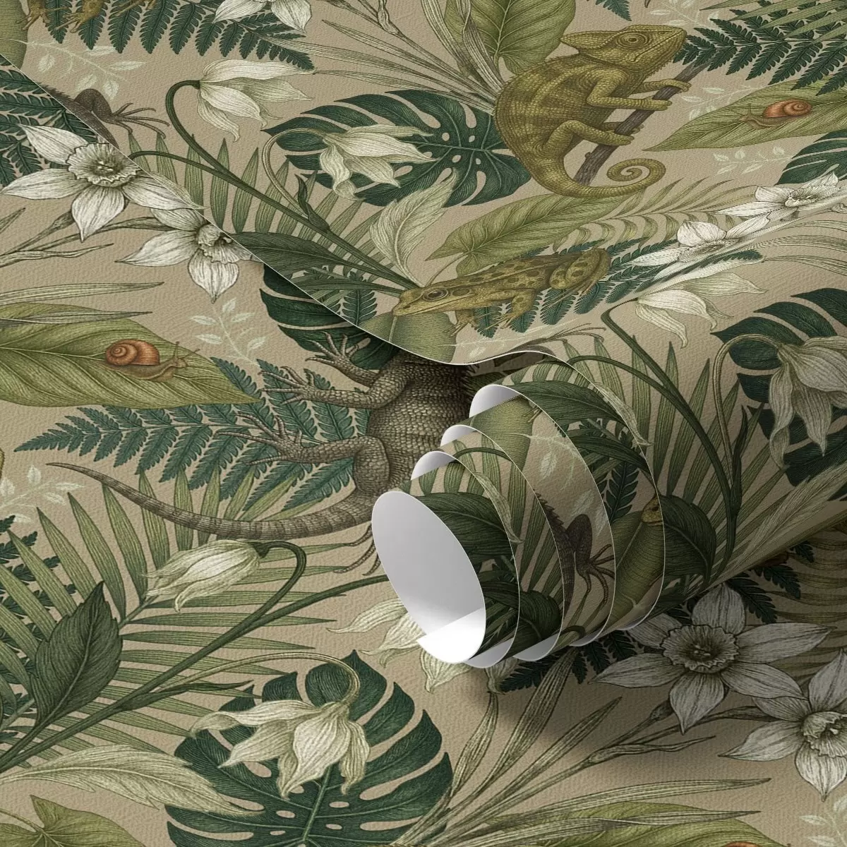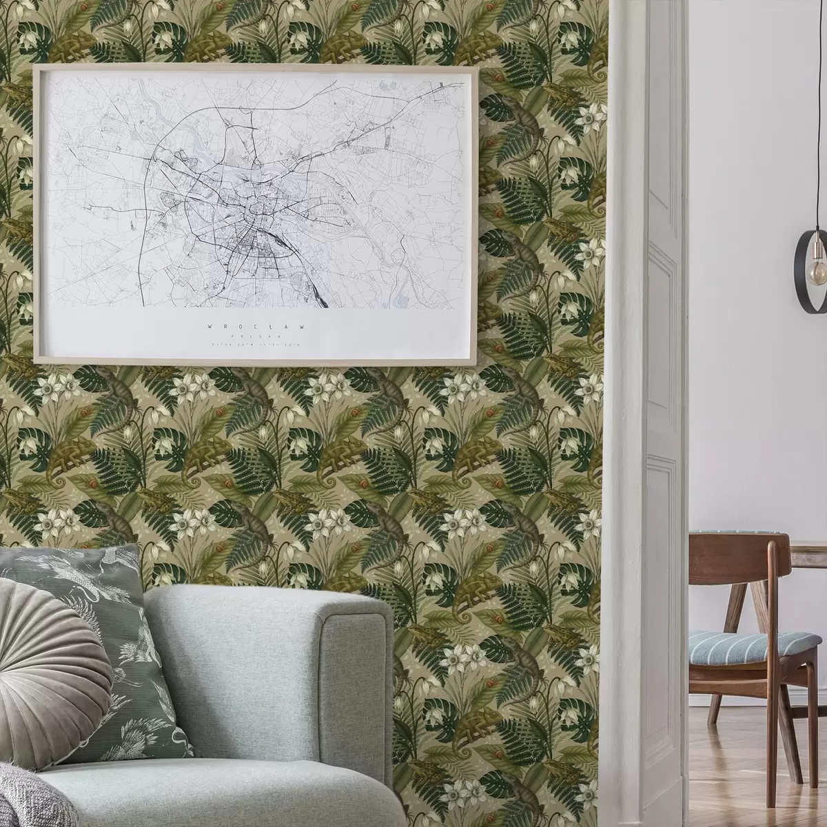 Tapetes Hamelioni un tropu lapas, baltas puķes, smilškrāsas fons Nr. a00608