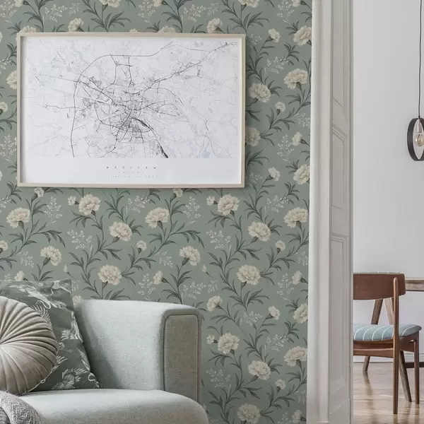 Tapetes Pūderveida neļķes uz pelēkzaļgana fona, izsmalcināts apdruka Nr. a00610