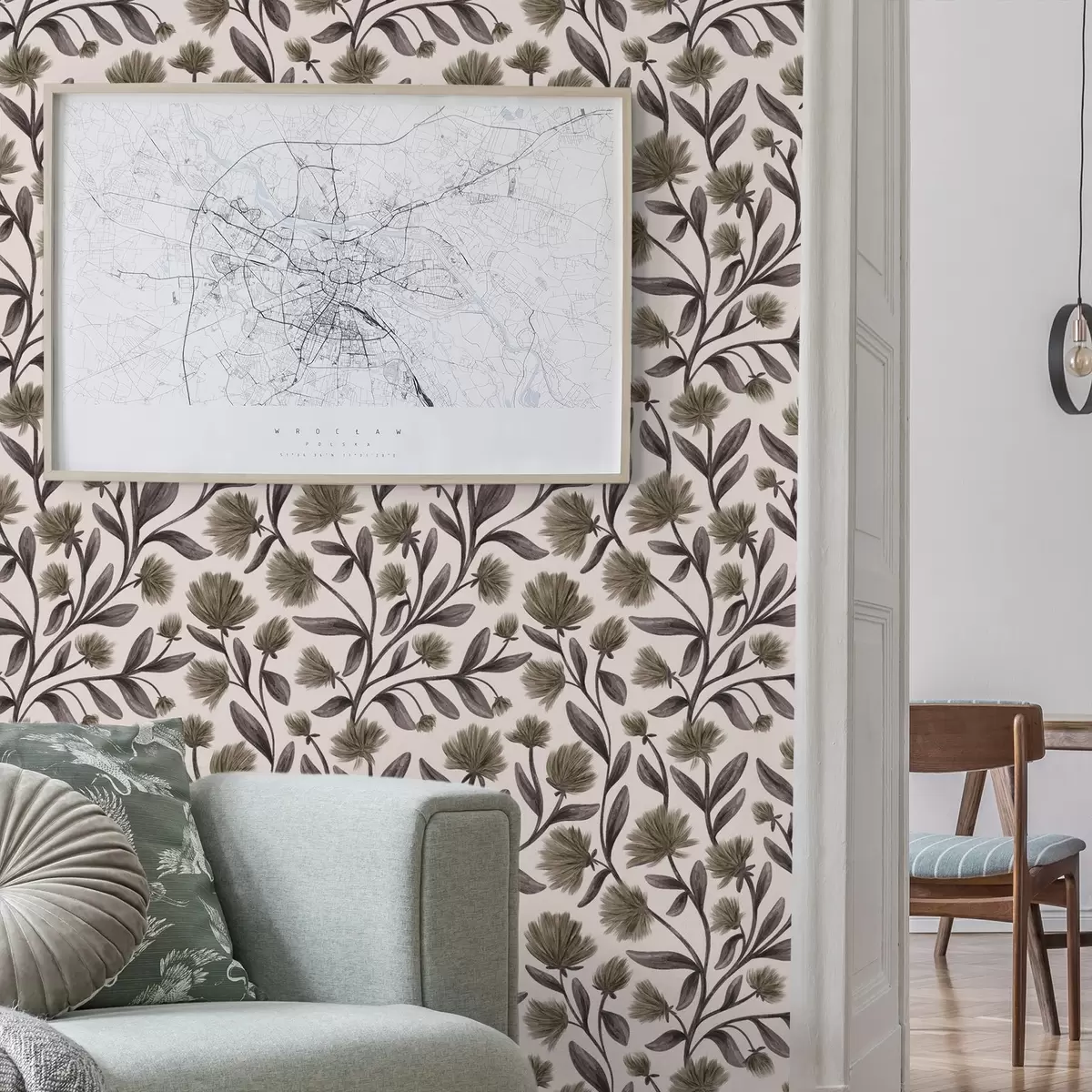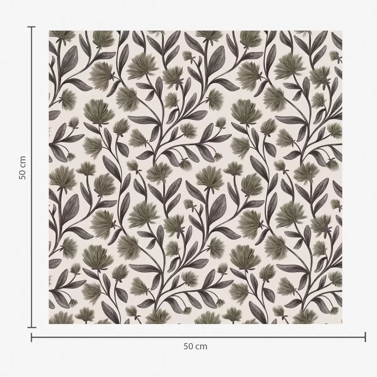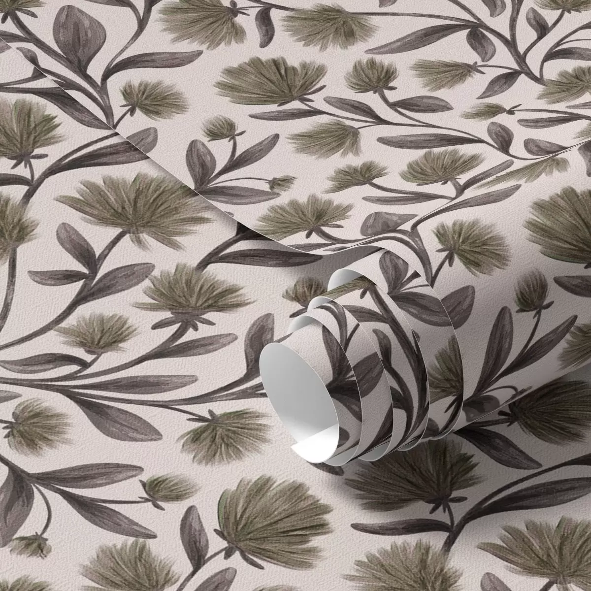 Tapetes Mežrozītes pelēkā-olīvu toņos uz krēmkrāsas fona Nr. a00623v1