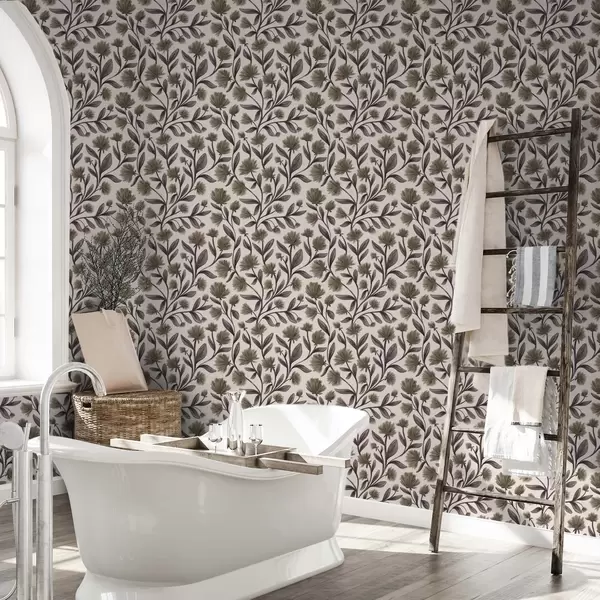 Tapetes Mežrozītes pelēkā-olīvu toņos uz krēmkrāsas fona Nr. a00623v1
