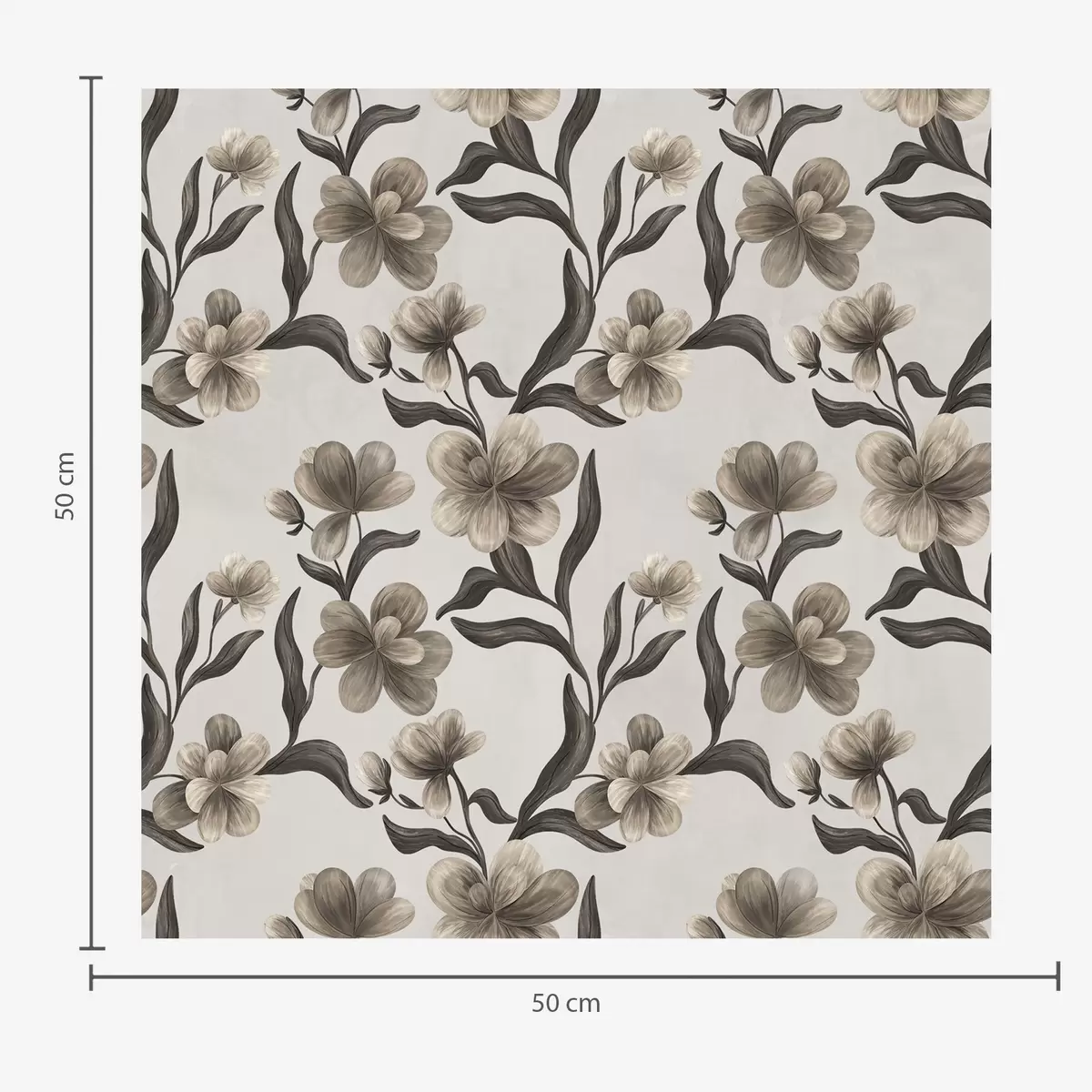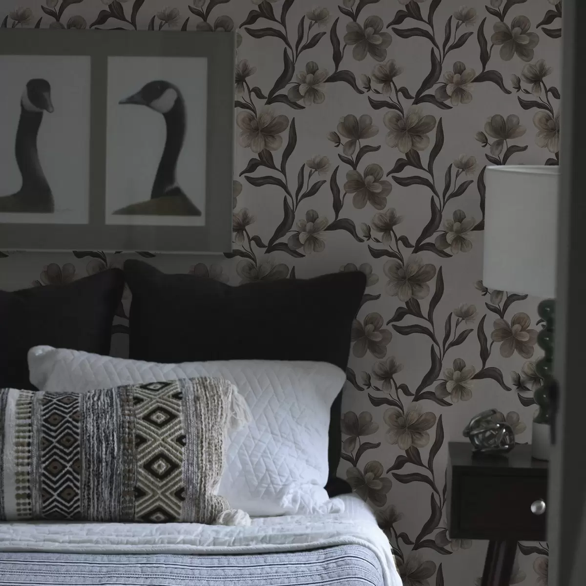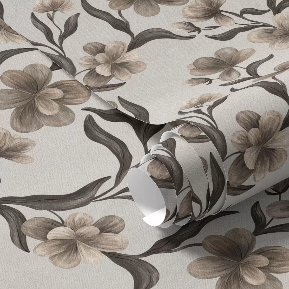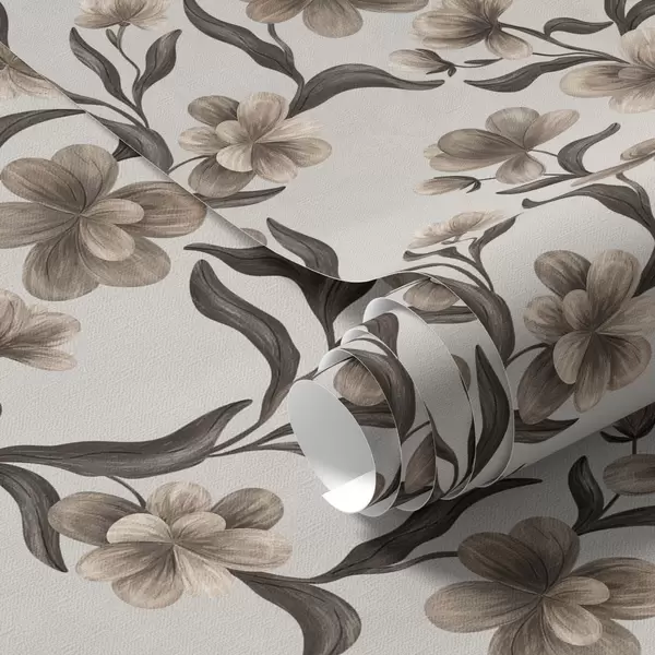 Tapetes Bēša krāsas ziedi un tumši zari uz gaiši pelēka fona Nr. a00626v1