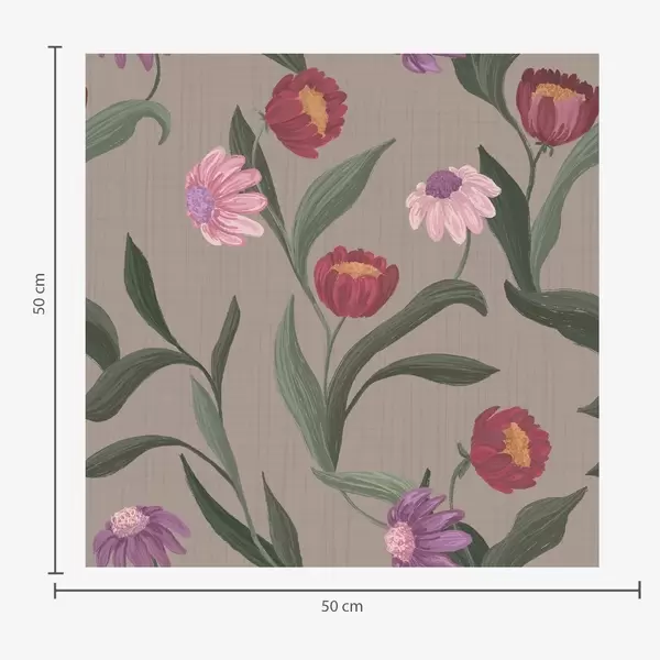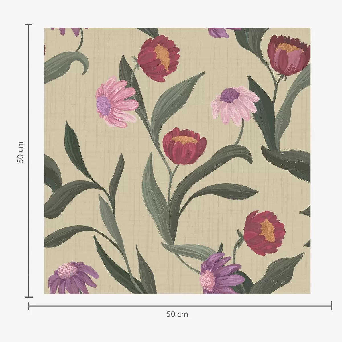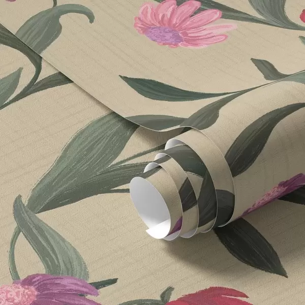 Tapetes Rozā-sarkanas puķes uz smilškrāsas fona, ar rokām zīmēta tekstūra Nr. a00631
