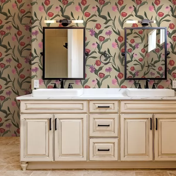 Tapetes Rozā-sarkanas puķes uz smilškrāsas fona, ar rokām zīmēta tekstūra Nr. a00631