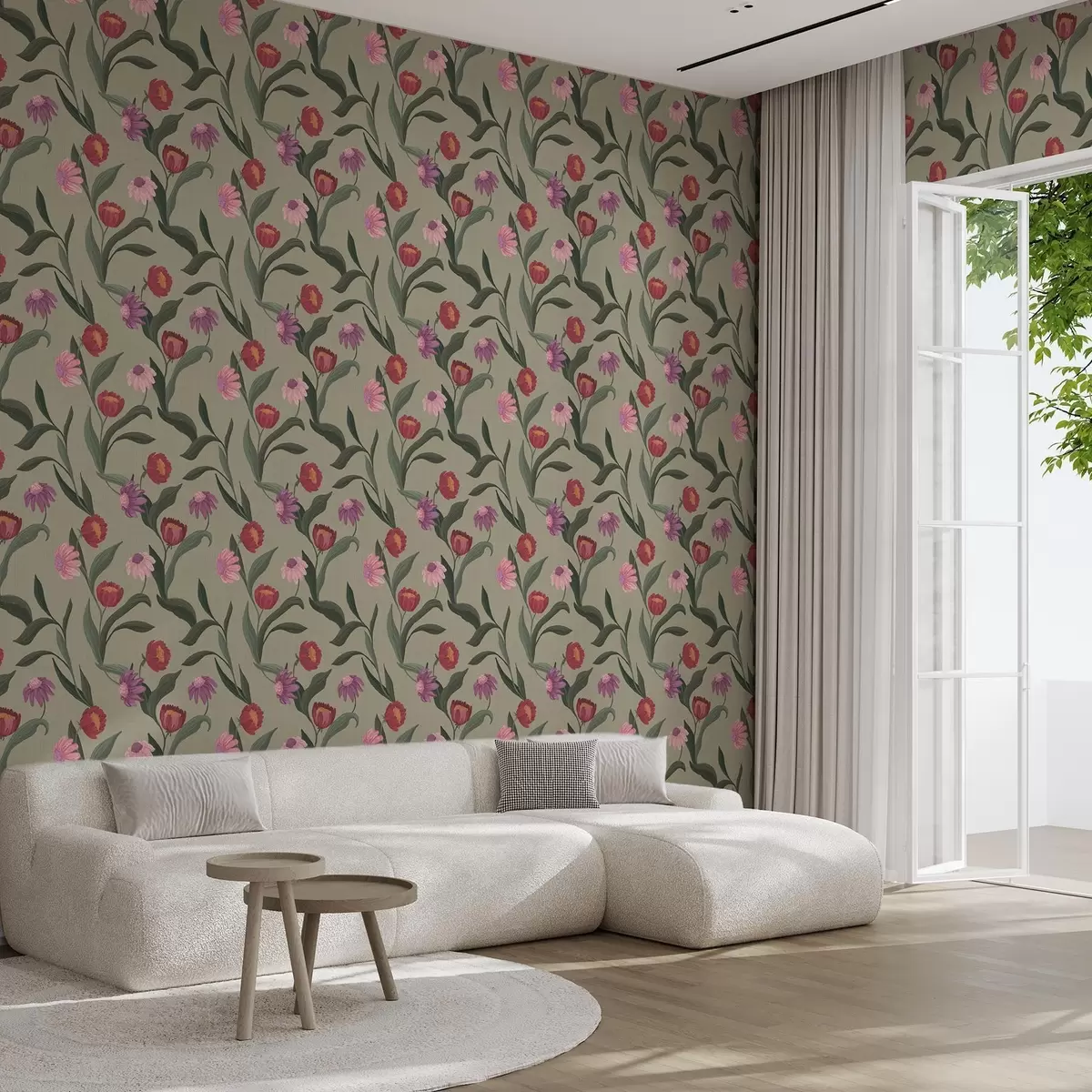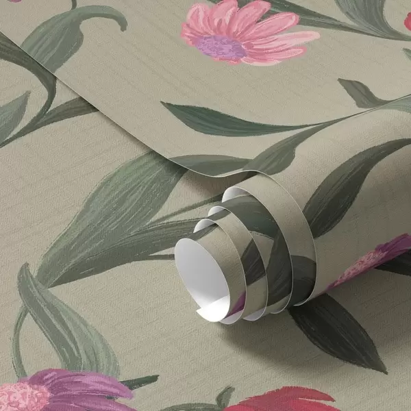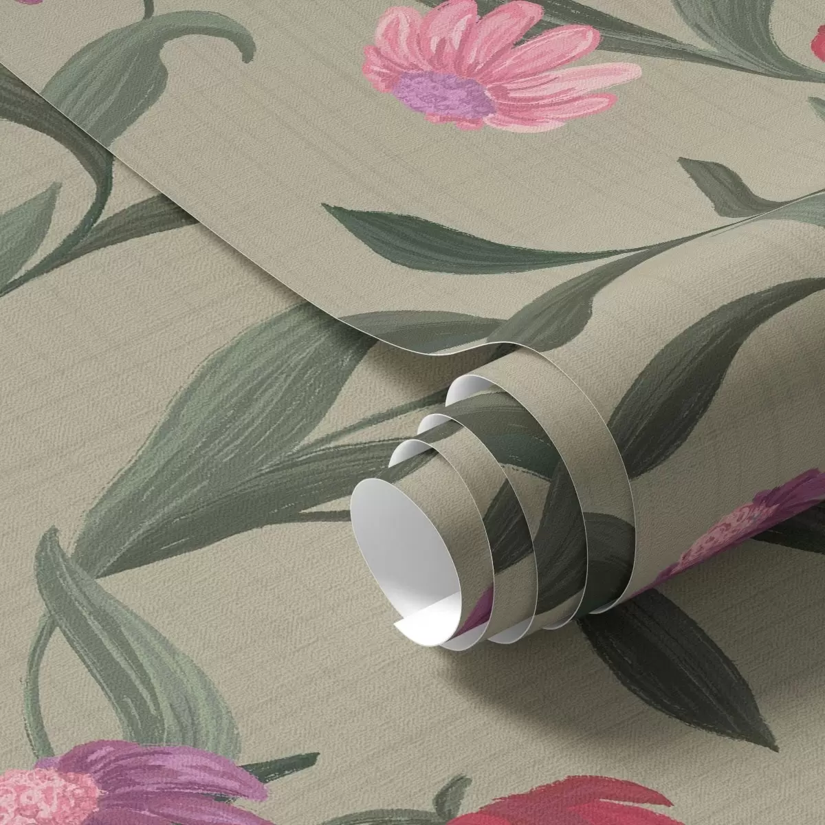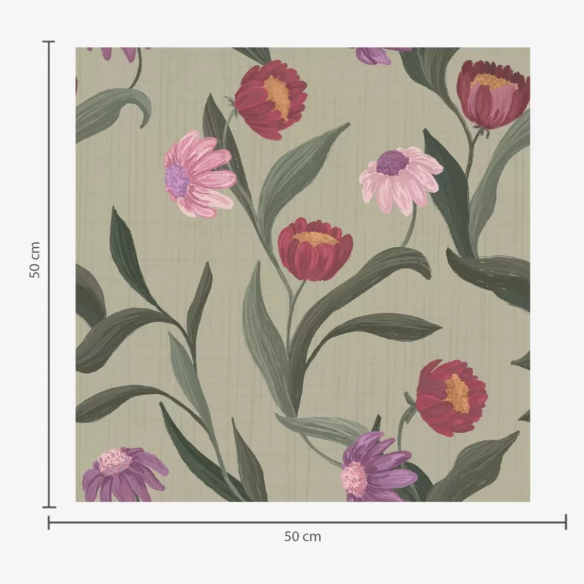 Tapetes Rozā-sarkanas puķes uz olīvu fona, audekla tekstūra Nr. a00631v1