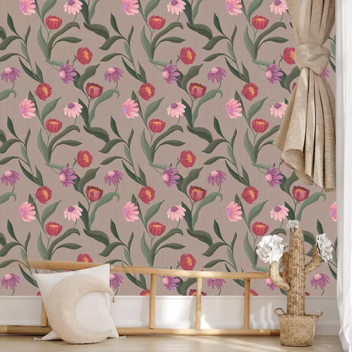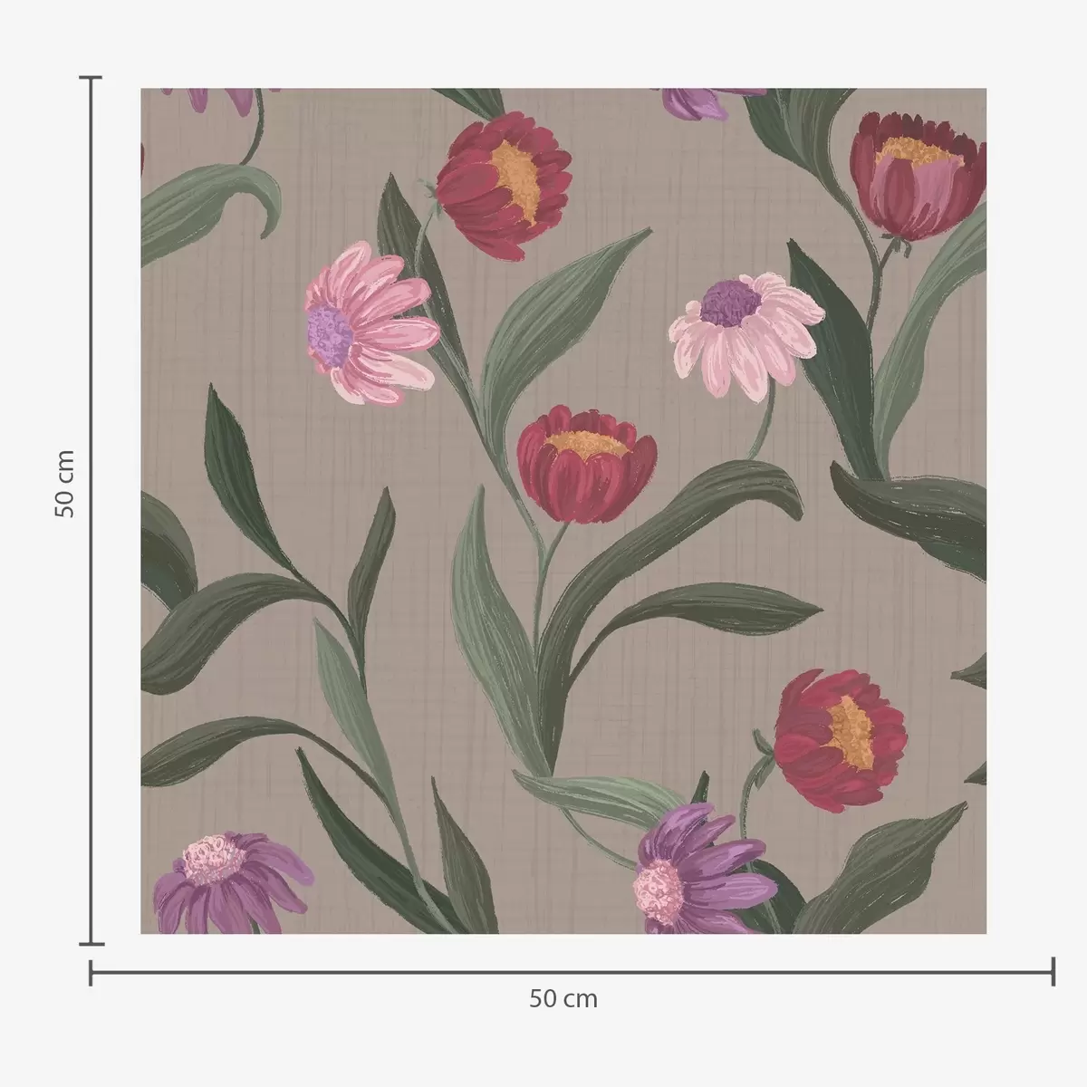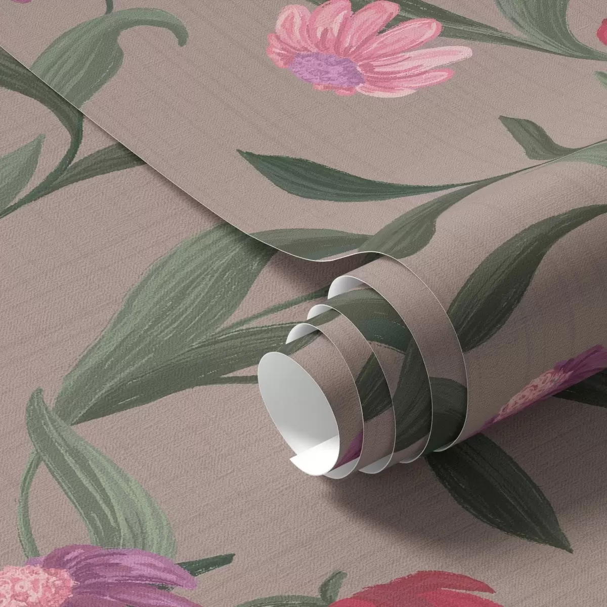 Tapetes Rozā-sarkanas ziedi uz pelēkbrūna fona, gari kāti Nr. a00631v2