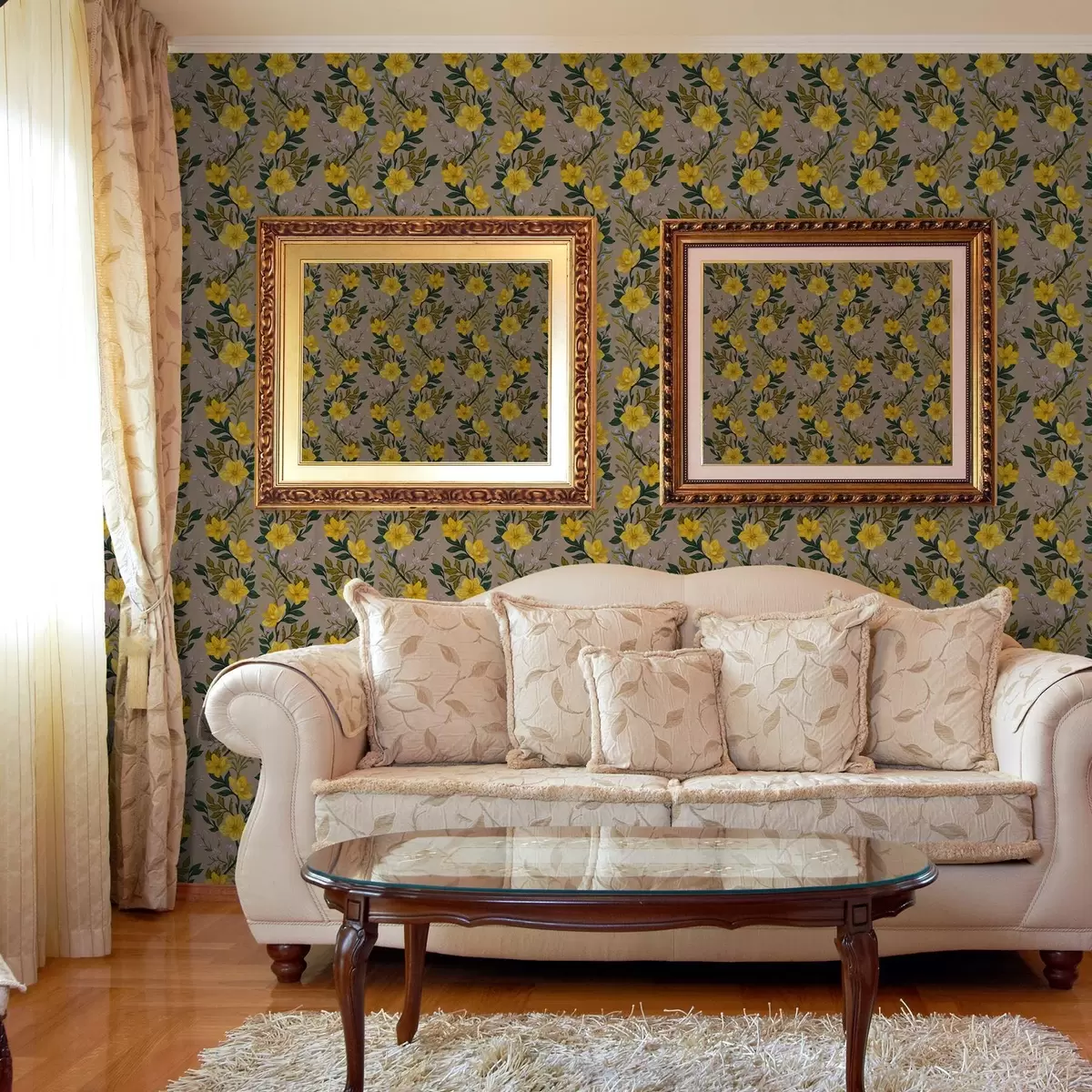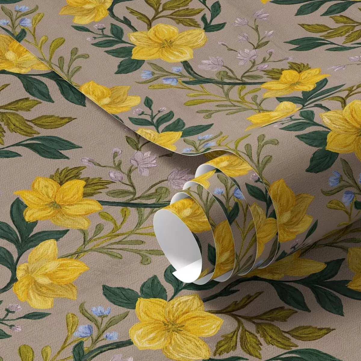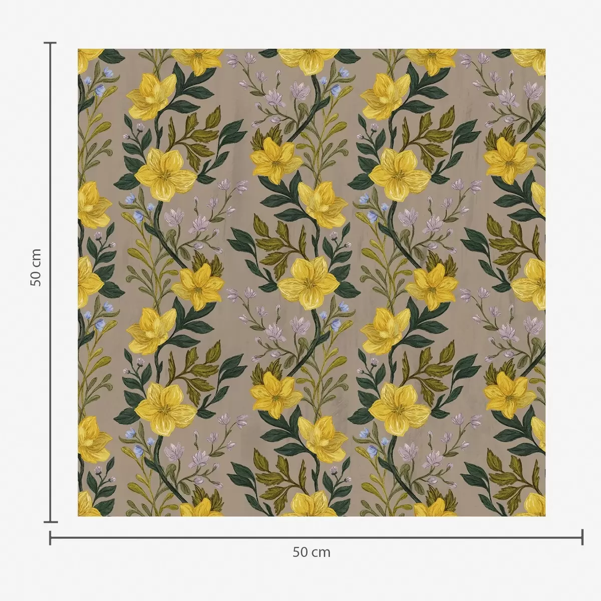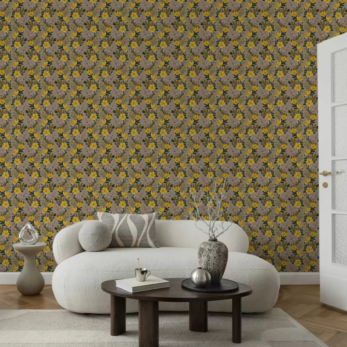 Tapetes Dzeltenas puķes vertikālās vītnēs uz pelēkbrūna fona Nr. a00632v1
