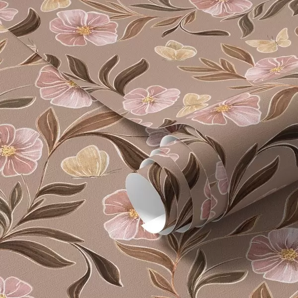 Tapetes Rozā ziedi un tauriņi uz siltā brūnā fona Nr. a00633v1