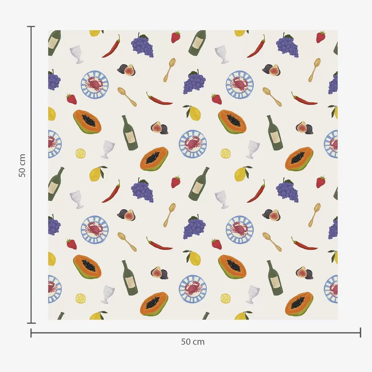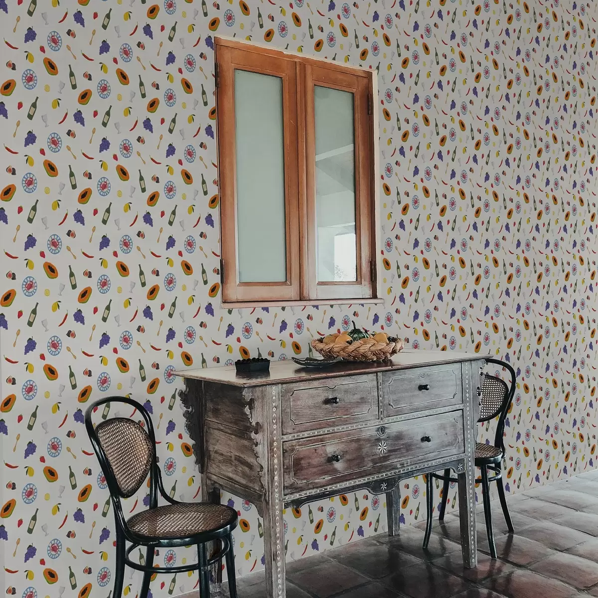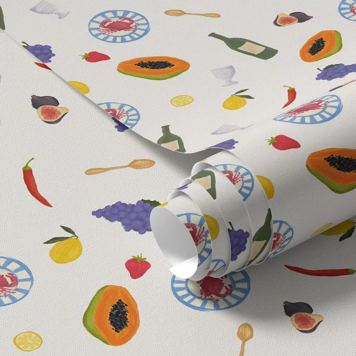 Tapetes Sakārtoti augļi, vīns un garšvielas uz gaiša fona Nr. a00639