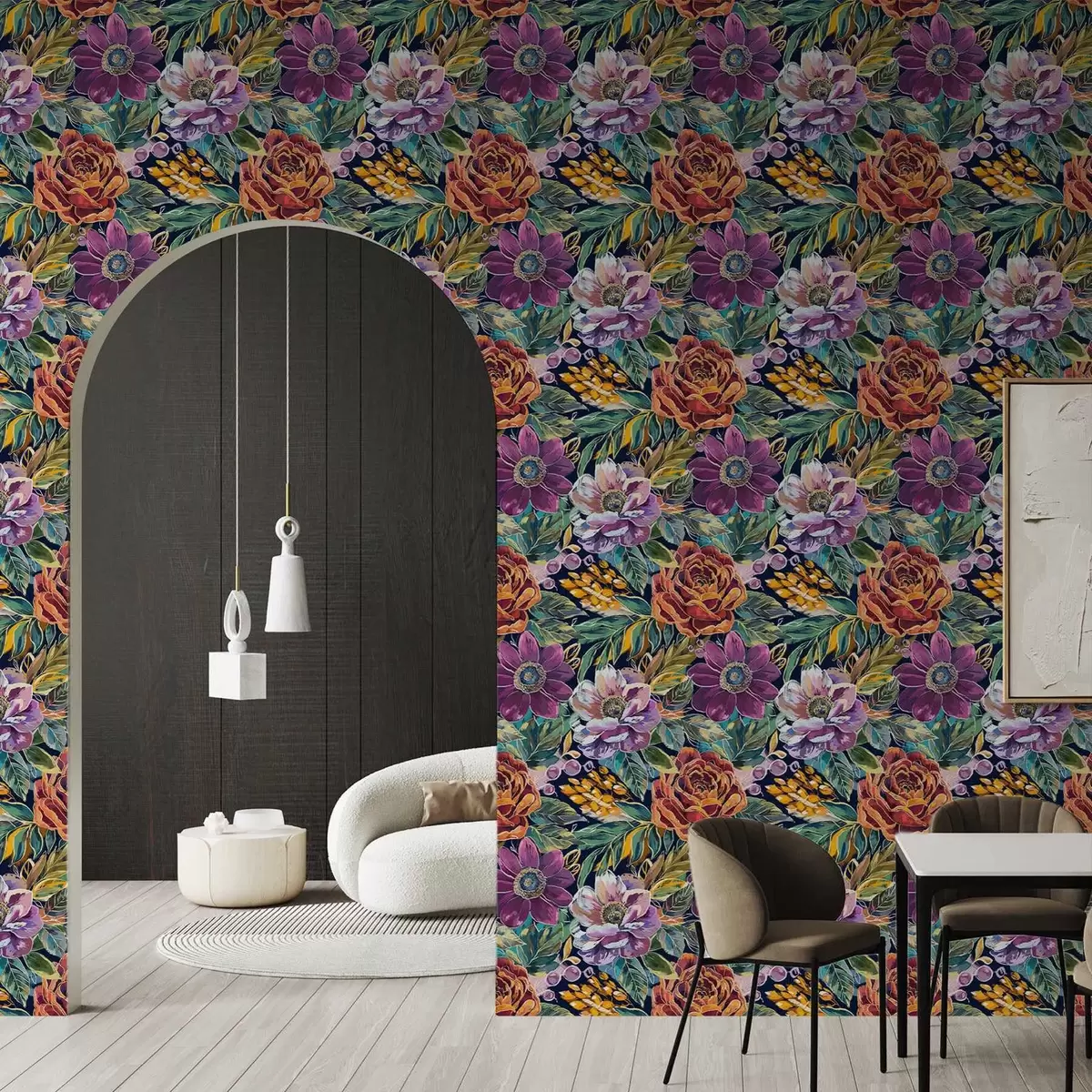 Tapetes Treknrakstā uz tumši zila fona uzgleznoti lieli ziedi Nr. a00643