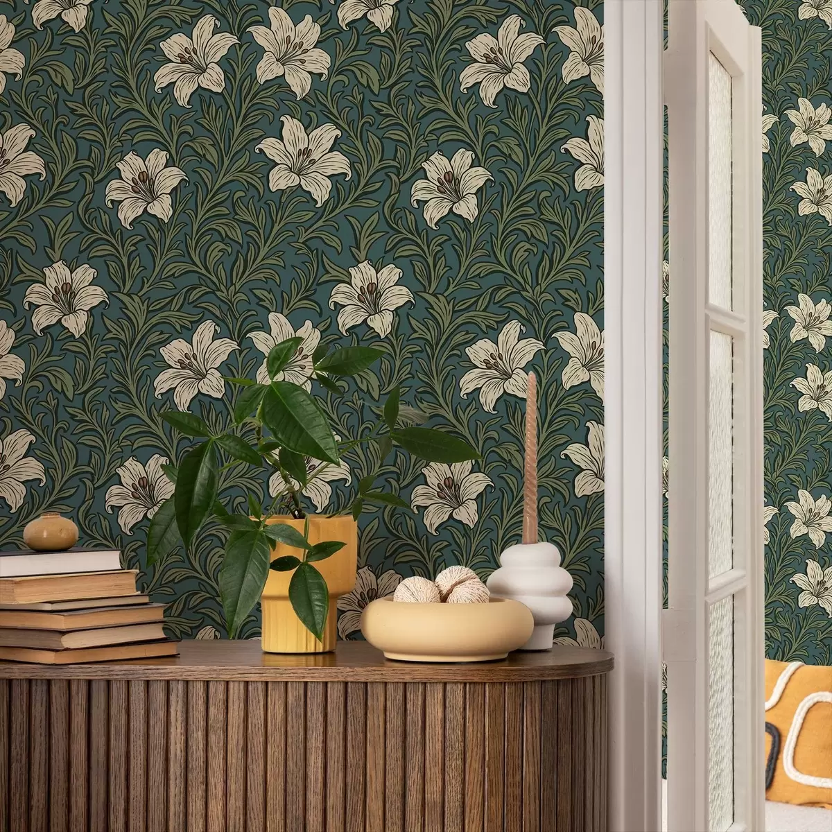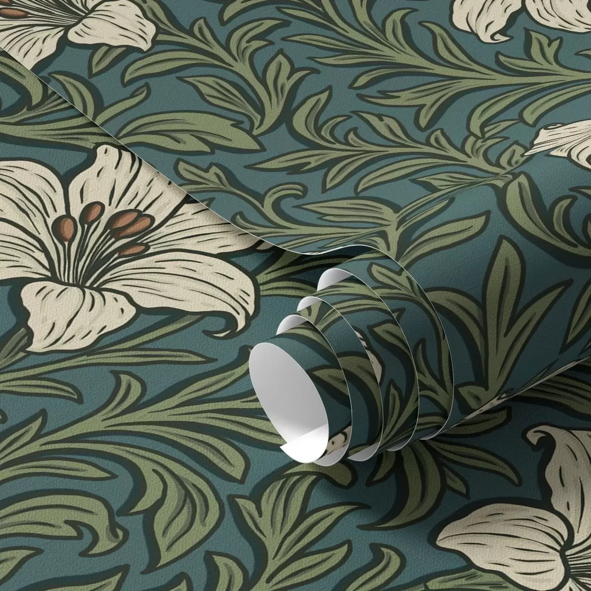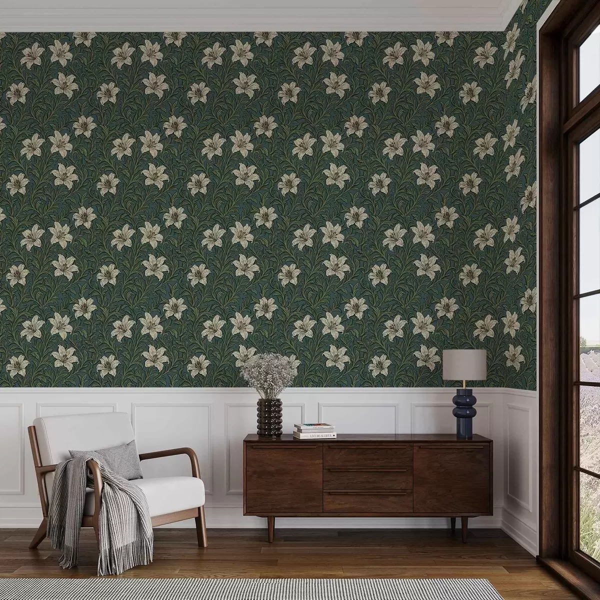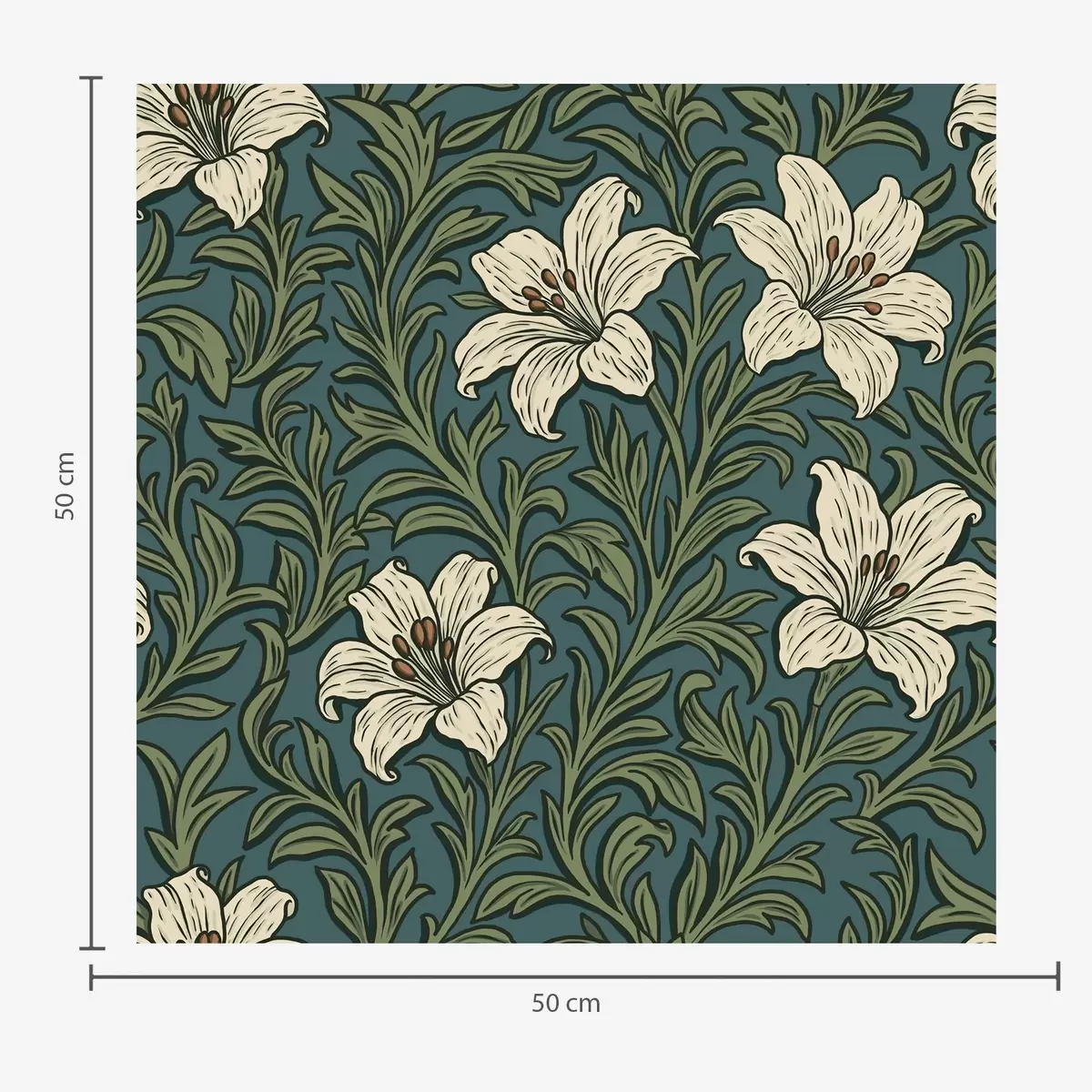 Tapetes Krēmkrāsas lilijas blīvā zaļumā uz tirkīza fona Nr. a00645